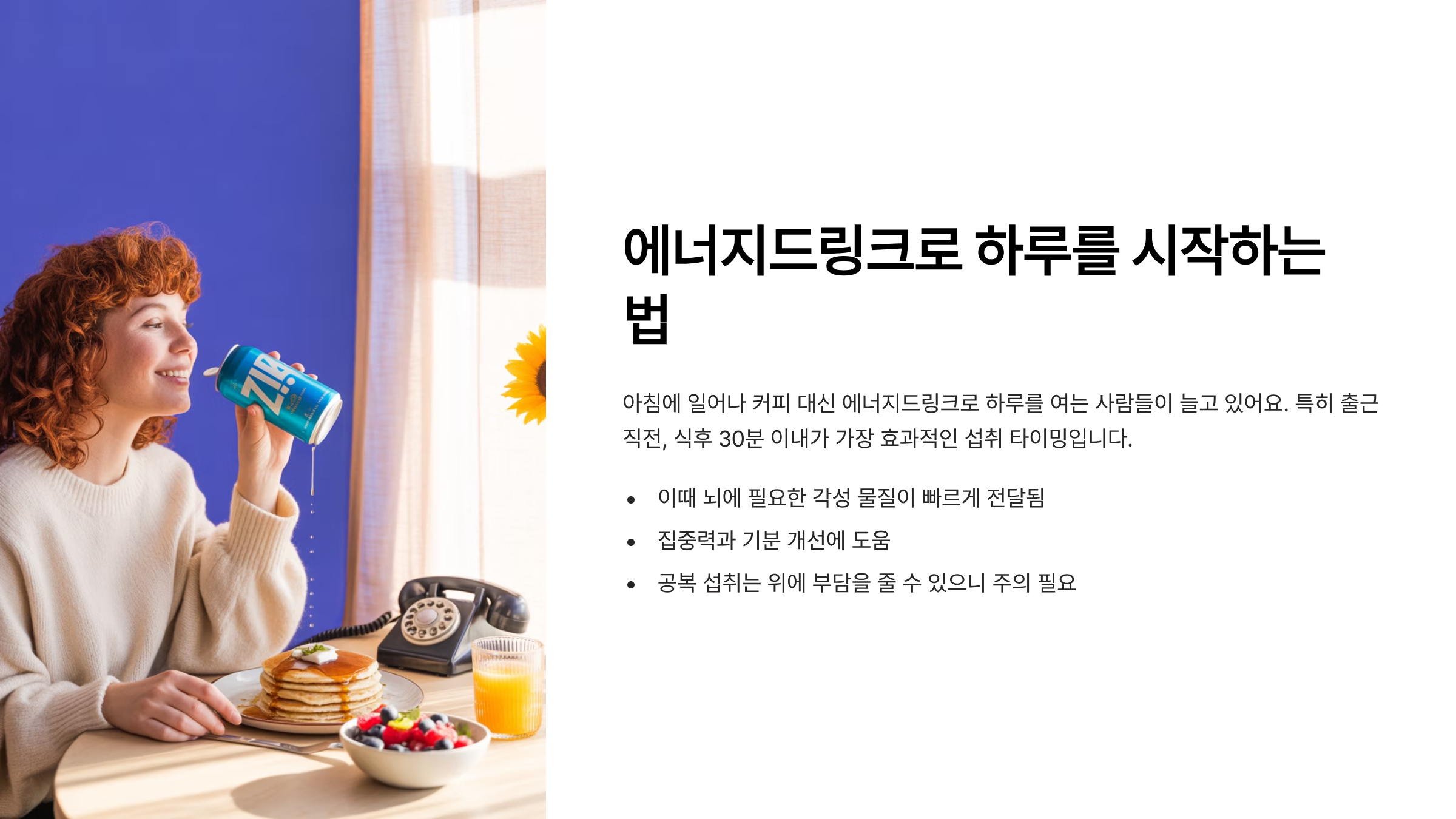 아침에 일어나 커피 대신 에너지드링크로 하루를 여는 사람들이 늘고 있어요. 특히 출근 직전, 식후 30분 이내가 가장 효과적인 섭취 타이밍입니다. 이때 뇌에 필요한 각성 물질이 빠르게 전달되며 집중력과 기분 개선에 도움을 줍니다. 하지만 공복 섭취는 위에 부담을 줄 수 있으니 주의가 필요해요.