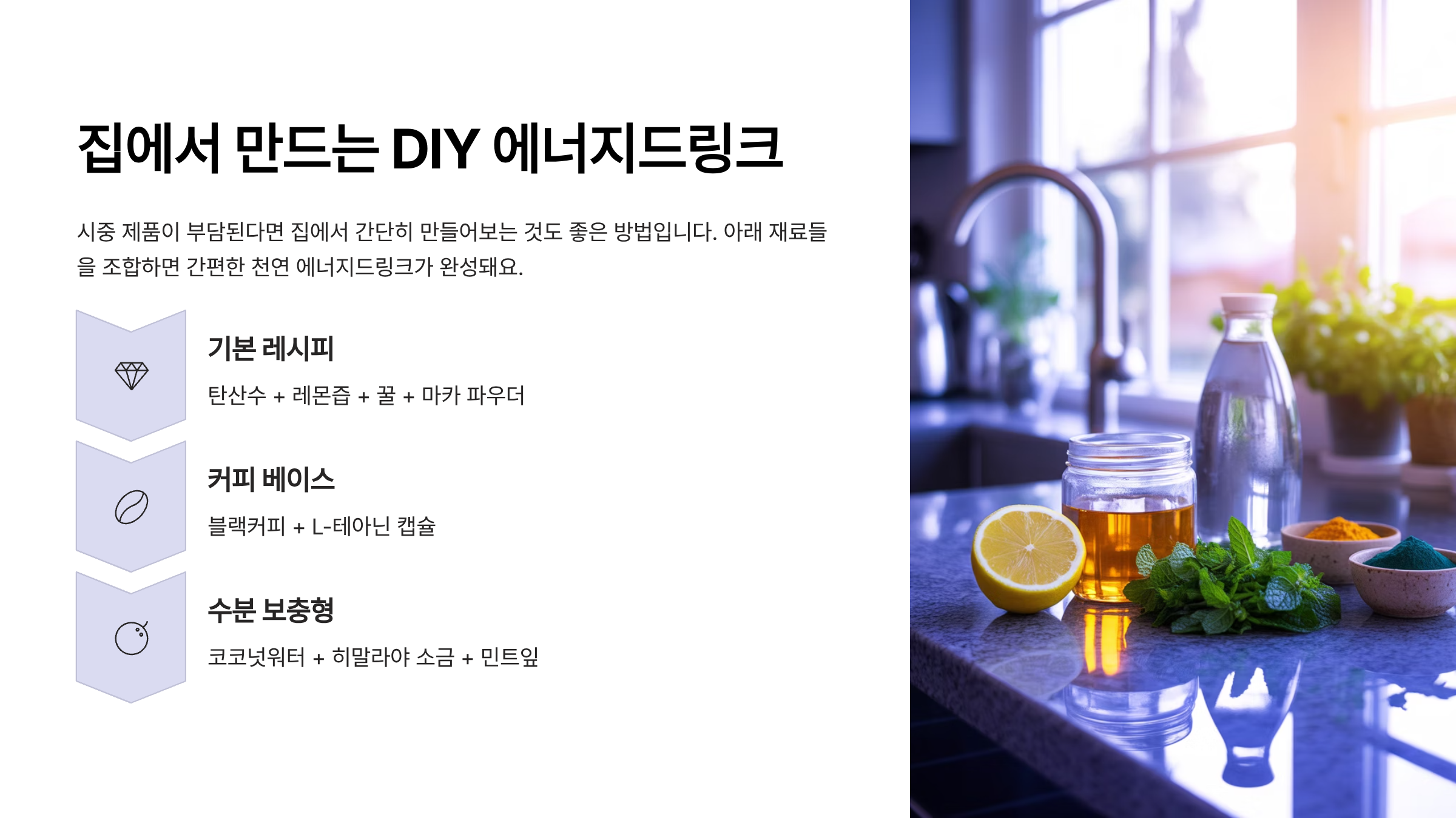 시중 제품이 부담된다면 집에서 간단히 만들어보는 것도 좋은 방법입니다. 아래 재료들을 조합하면 간편한 천연 에너지드링크가 완성돼요.