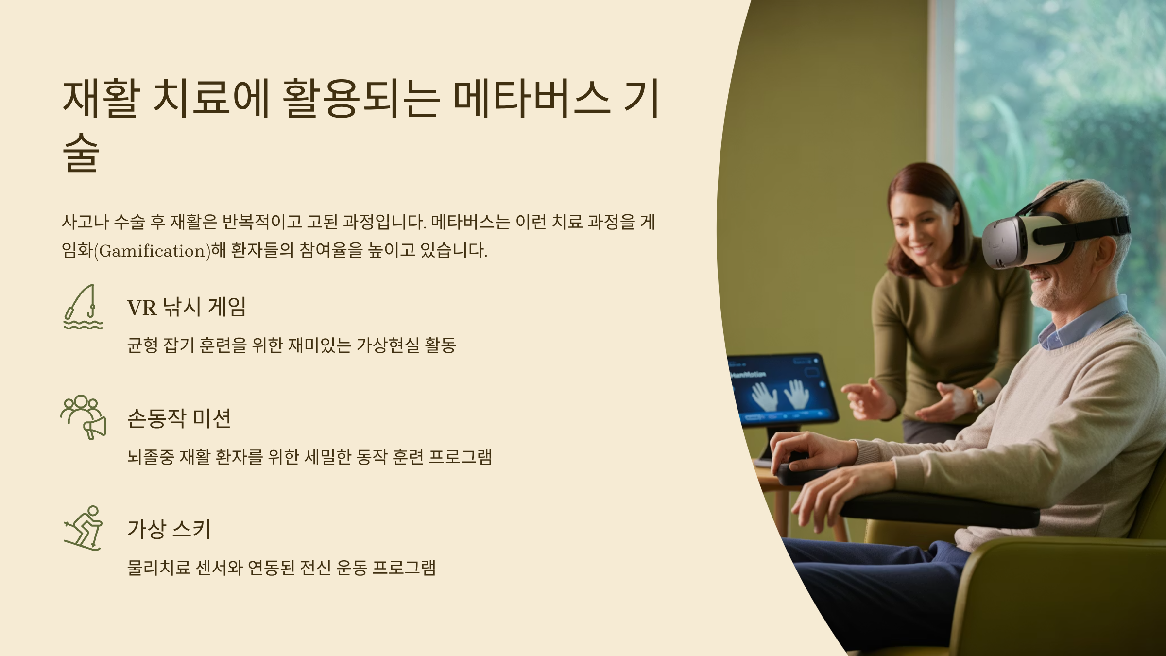 사고나 수술 후 재활은 반복적이고 고된 과정입니다. 메타버스는 이런 치료 과정을 게임화(Gamification)해 환자들의 참여율을 높이고 있어요.