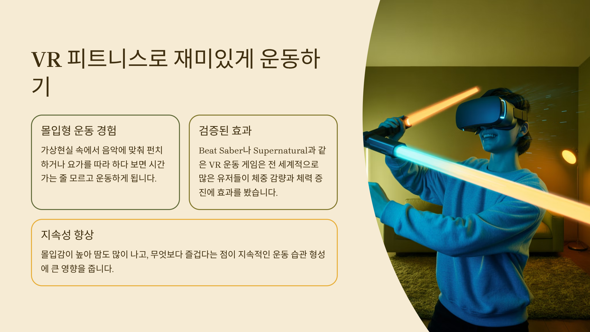 운동이 지루하고 귀찮게 느껴질 때, VR 피트니스는 놀라운 대안이 됩니다. 가상현실 속에서 음악에 맞춰 펀치하거나 요가를 따라 하다 보면 시간 가는 줄 모르고 운동하게 돼요. 실제로 VR 운동 게임 Beat Saber나 Supernatural은 전 세계적으로 많은 유저들이 체중 감량과 체력 증진에 효과를 봤다고 해요. 몰입감이 높아 땀도 많이 나고, 무엇보다 즐겁다는 점이 지속성에 큰 영향을 줘요.