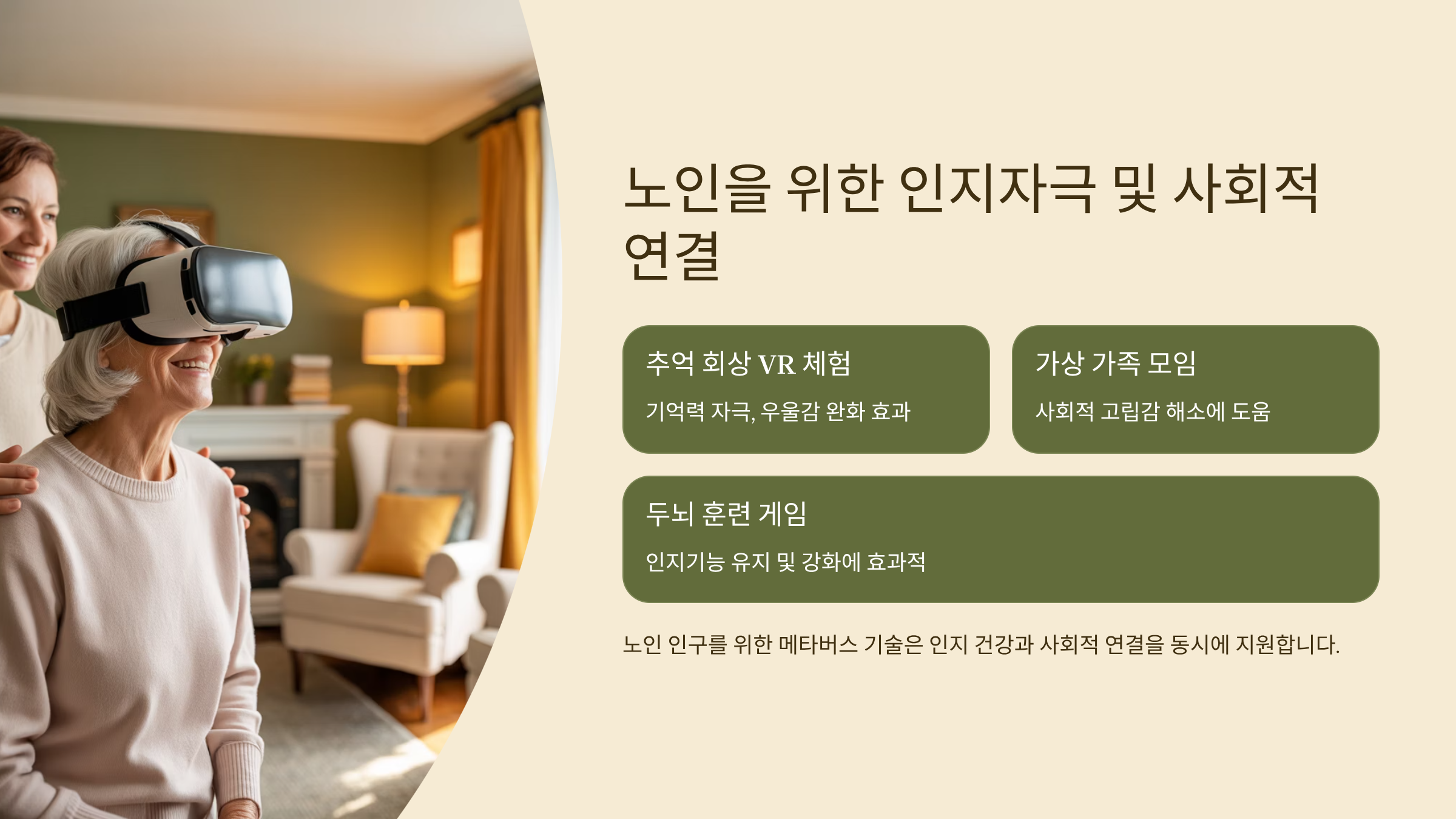 | 추억 회상 VR 체험 | 기억력 자극, 우울감 완화 |