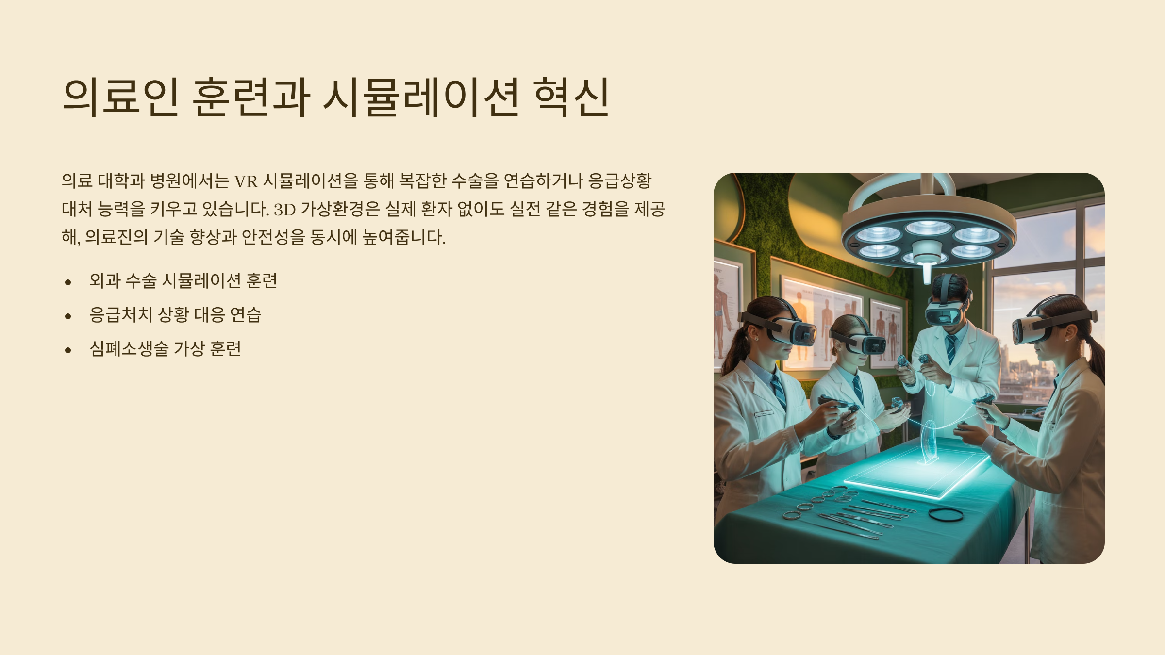 의료 대학과 병원에서는 VR 시뮬레이션을 통해 복잡한 수술을 연습하거나 응급상황 대처 능력을 키우고 있어요. 3D 가상환경은 실제 환자 없이도 실전 같은 경험을 제공해, 의료진의 기술 향상과 안전성을 동시에 높여줍니다. 특히 외과 수술, 응급처치, 심폐소생술 훈련 등에 많이 활용되고 있답니다.