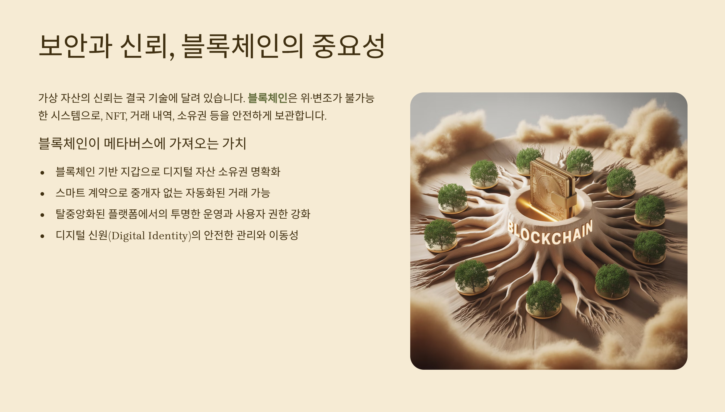 가상 자산의 신뢰는 결국 기술에 달려 있습니다. 블록체인은 위·변조가 불가능한 시스템으로, NFT나 거래 내역, 소유권 등을 안전하게 보관합니다. 특히 중앙 통제 없이 운영되어, 사용자 중심의 경제를 가능하게 하죠.
