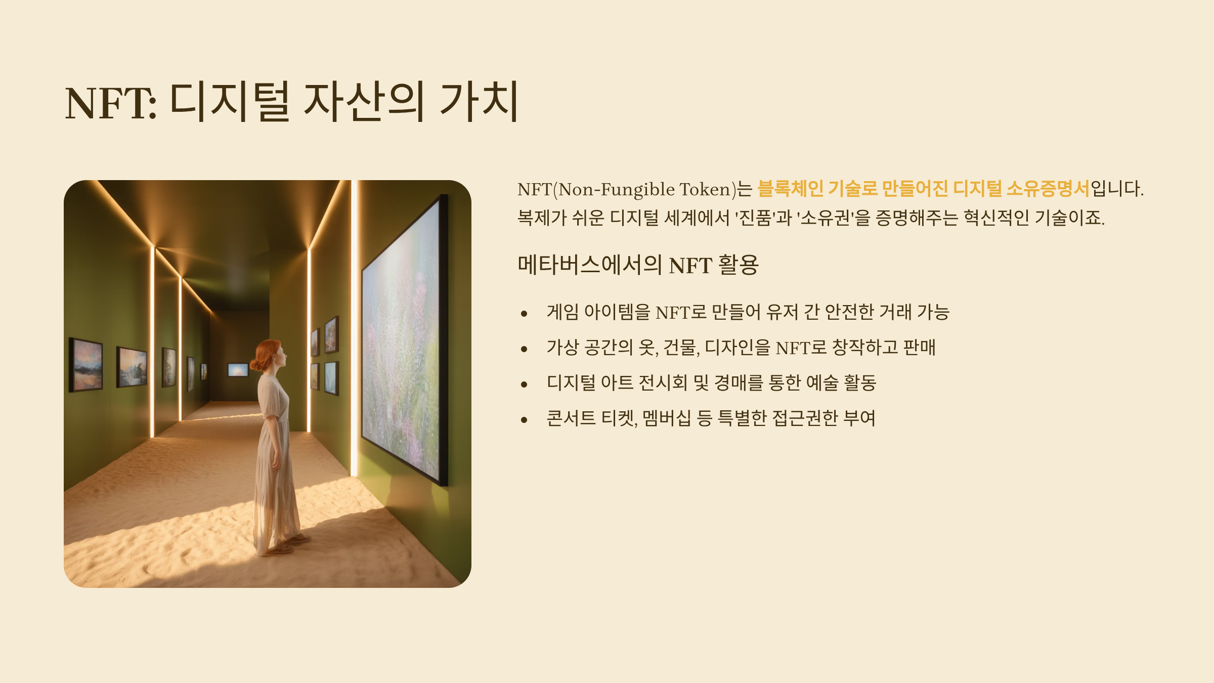 NFT는 블록체인 기술로 만들어진 디지털 소유증명서입니다. 메타버스에서 아이템, 캐릭터, 예술작품, 음악까지 모든 것이 NFT로 거래될 수 있어요.