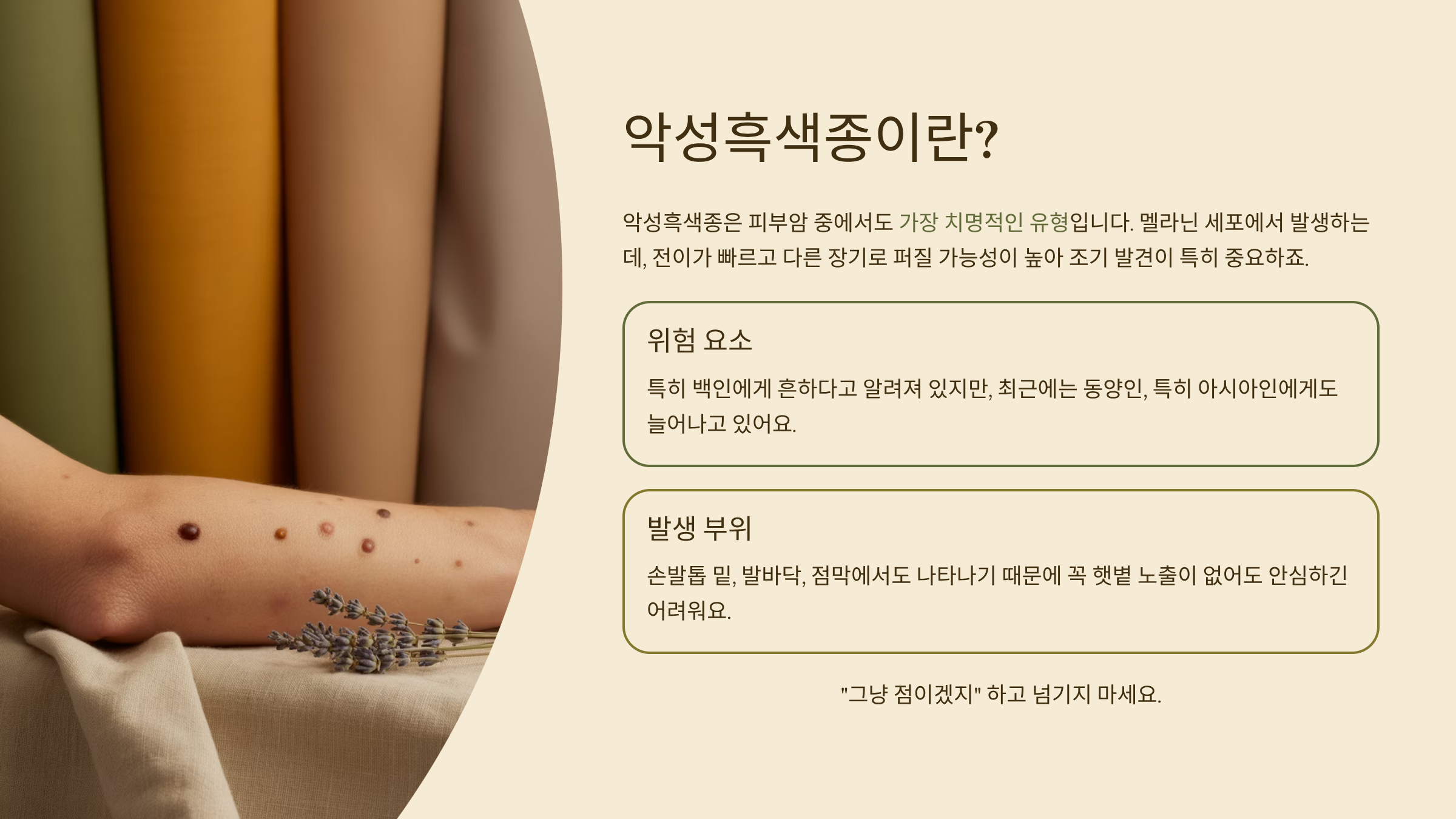 안녕하세요, 여러분. 제가 몇 달 전 피부과에서 진단받은 경험이 있었어요. 평범한 점인 줄 알았는데, 의사 선생님께서 “정밀검사 필요하다”고 하시더라구요. 다행히 악성흑색종은 아니었지만, 그때 얼마나 무서웠는지 몰라요. 그래서 오늘은 피부암 중 가장 치명적이라 불리는 악성흑색종에 대해 철저히 파헤쳐보고, 특히 주목받고 있는 면역치료에 대한 숨은 이야기까지 모두 알려드릴게요. 이 글 한 편이면 여러분도 전문가 못지않게 알 수 있을 거예요.