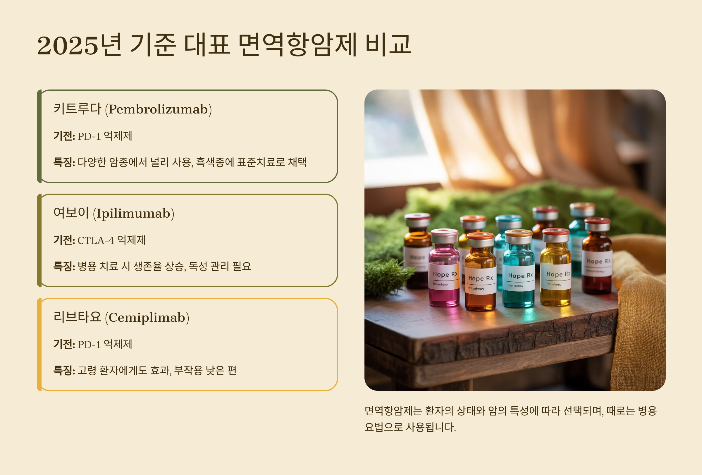 | 키트루다 (Pembrolizumab) | PD-1 억제제 | 다양한 암종에서 널리 사용, 흑색종에 표준치료로 채택 |