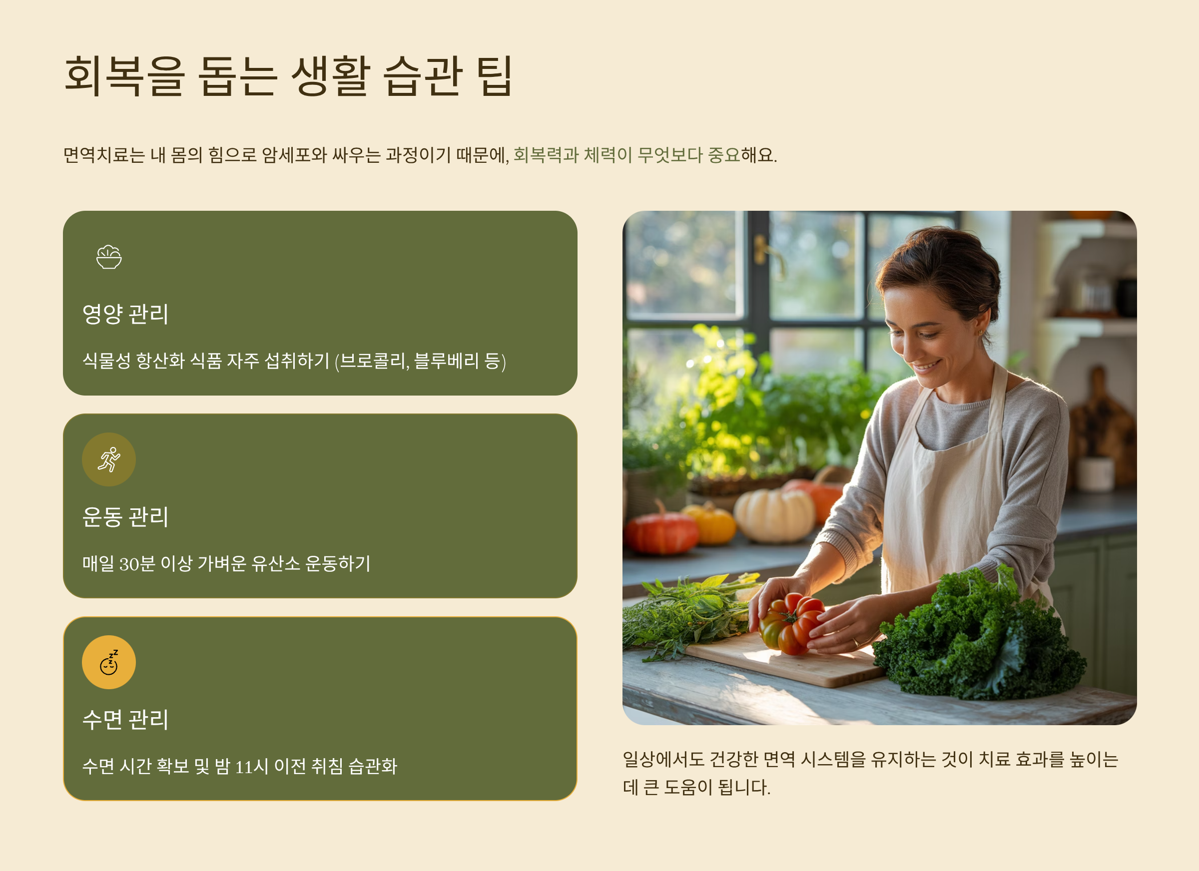 면역치료는 내 몸의 힘으로 암세포와 싸우는 과정이기 때문에, 회복력과 체력이 무엇보다 중요해요. 아래 팁들을 참고해서 일상에서도 건강한 면역 시스템을 유지해보세요.
