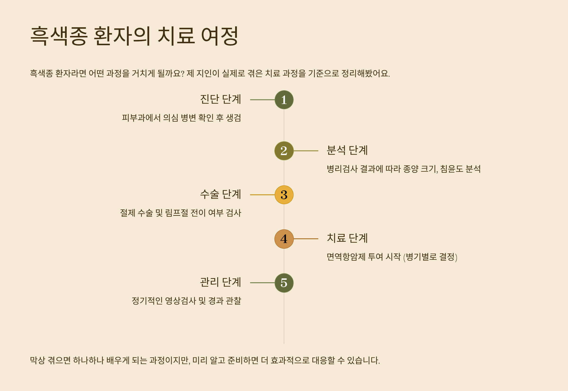 흑색종 환자라면 어떤 과정을 거치게 될까요? 제 지인이 실제로 겪은 치료 과정을 기준으로 정리해봤어요. 처음 듣는 단어들도 있겠지만, 막상 겪으면 하나하나 배우게 되더라고요.