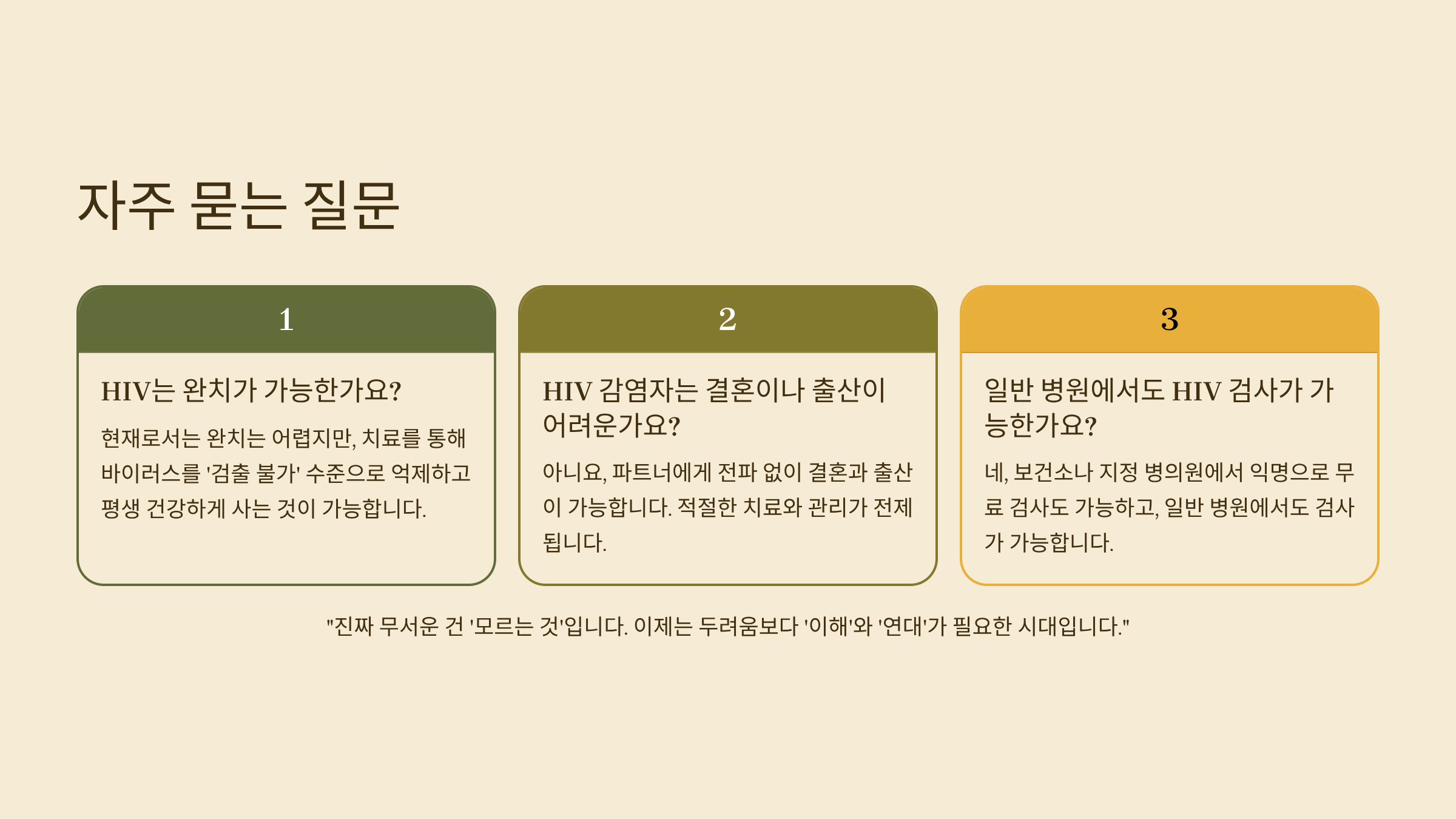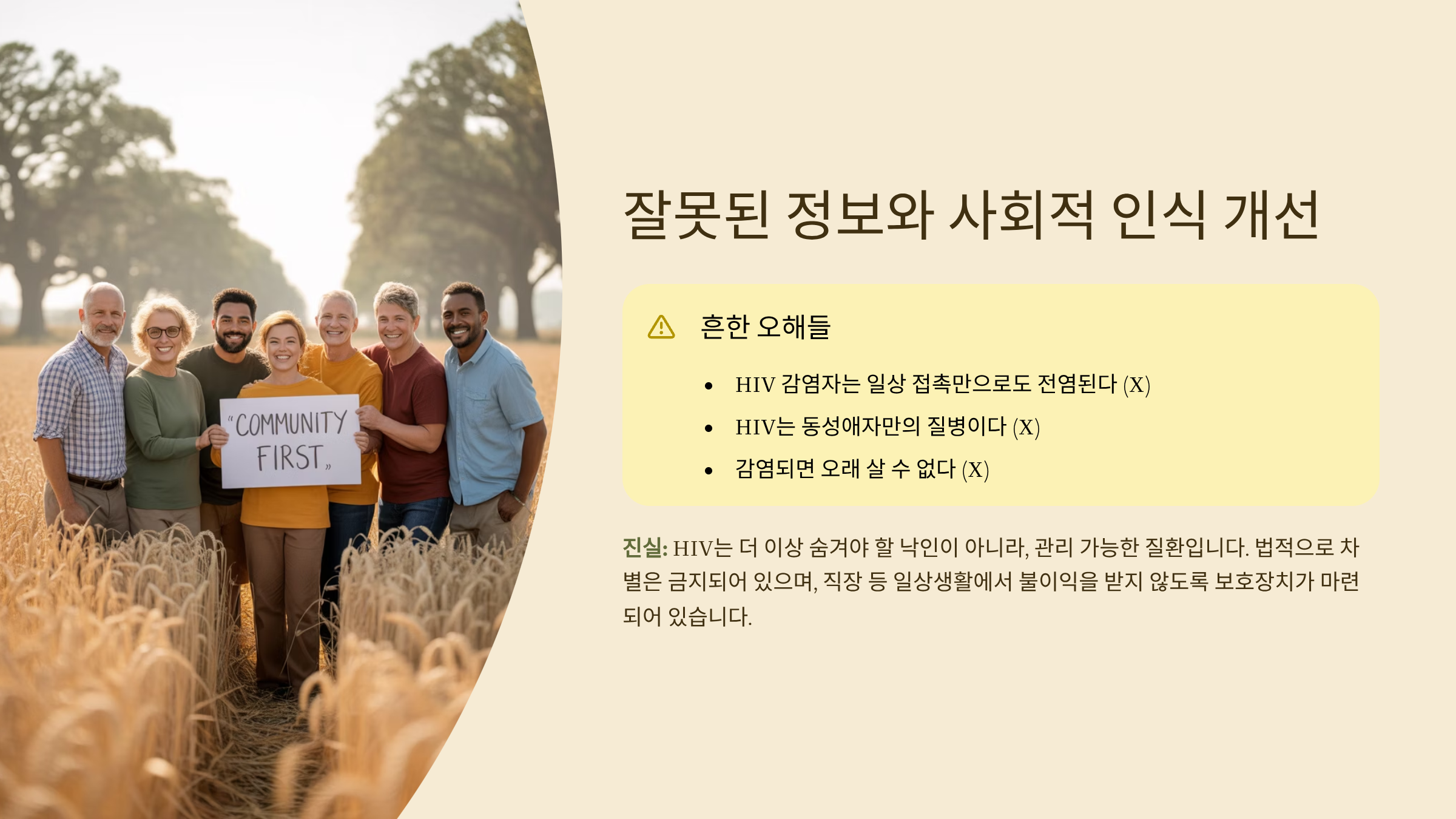 우리는 여전히 HIV를 무섭게 느낄 수 있어요. 하지만 진짜 무서운 건 ‘모르는 것’이 아닐까요? 이제는 두려움보다 ‘이해’와 ‘연대’가 필요한 시대예요. HIV는 더 이상 숨겨야 할 낙인이 아니라, 관리 가능한 질환이며, 치료와 예방은 여러분 손 안에 있어요. 이 글을 통해 오해를 풀고, 주변 사람들과도 건강한 대화를 시작해보세요. 작은 정보 공유가 누군가의 삶을 지켜줄 수 있으니까요.