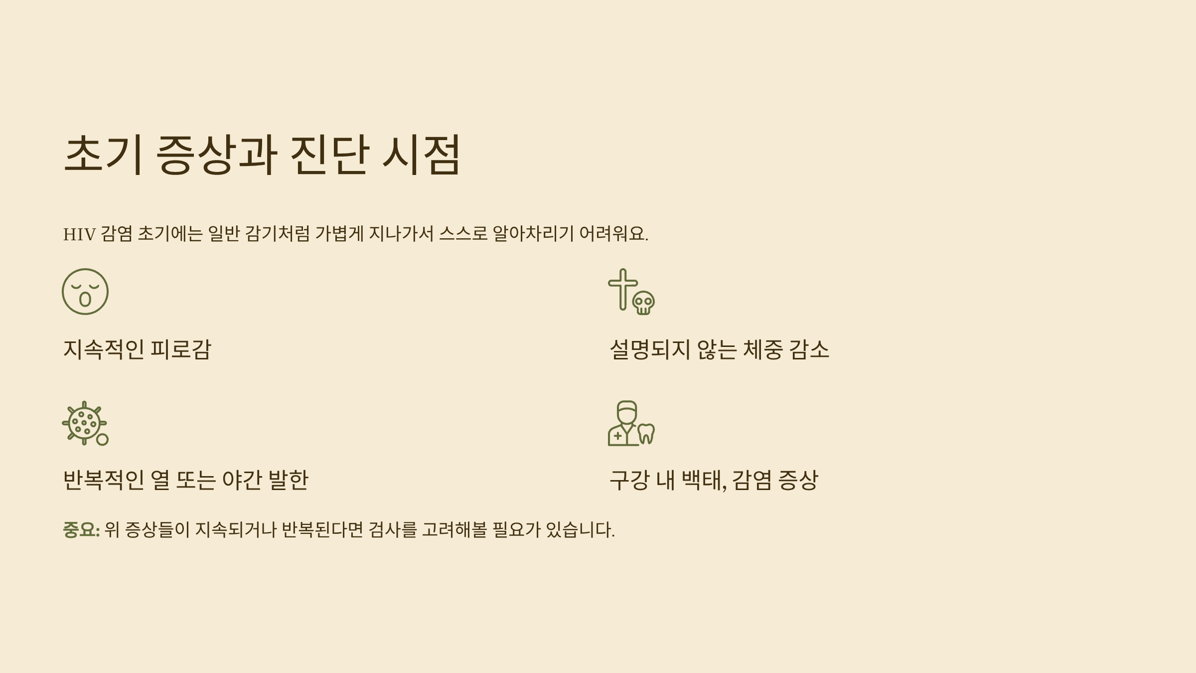 HIV 감염 초기에는 일반 감기처럼 가볍게 지나가서 스스로 알아차리기 어려워요. 하지만 아래 증상들이 지속되거나 반복된다면 검사를 고려해볼 필요가 있습니다.