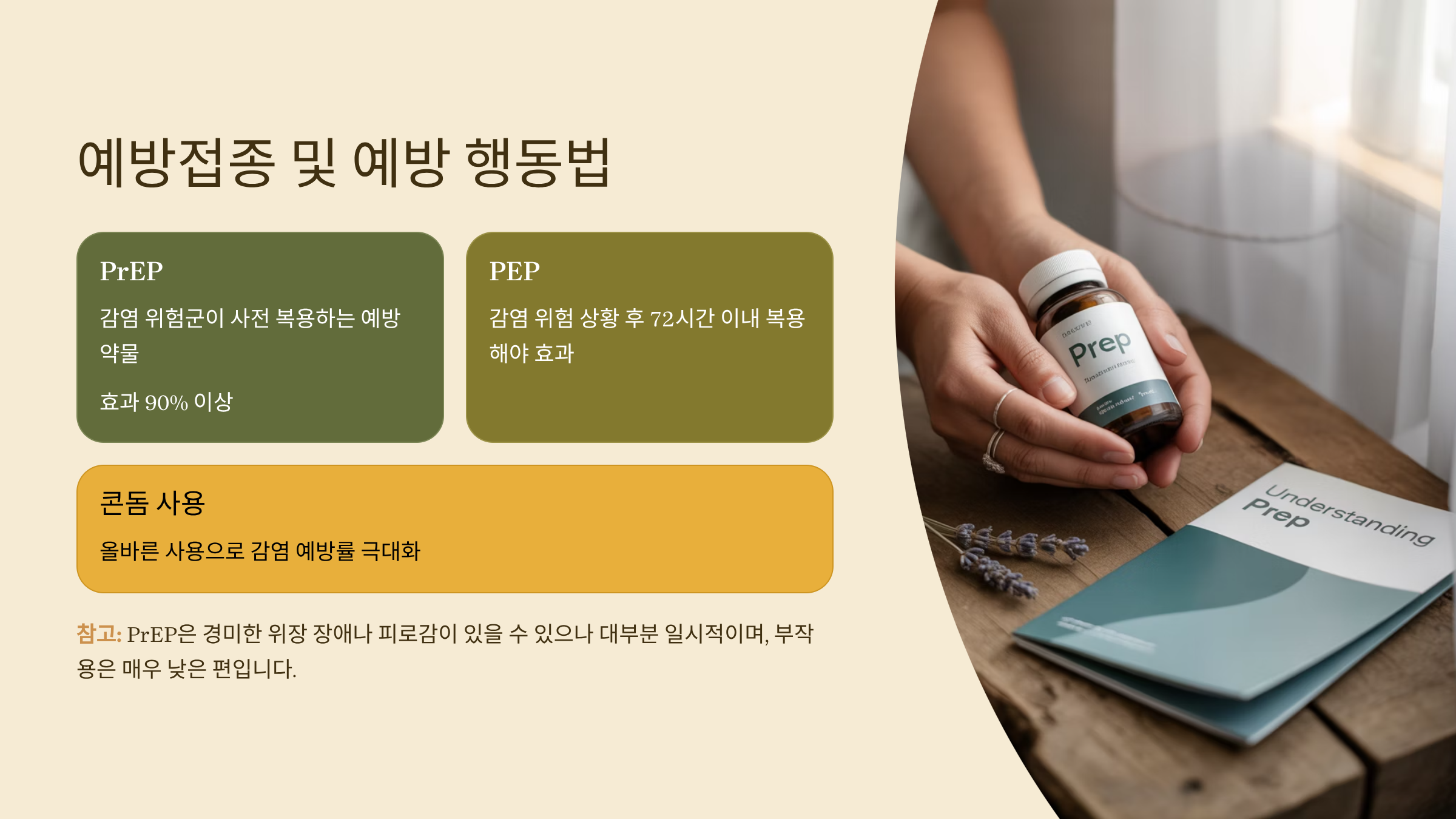 | PEP | 감염 위험 상황 후 72시간 이내 복용해야 효과 |