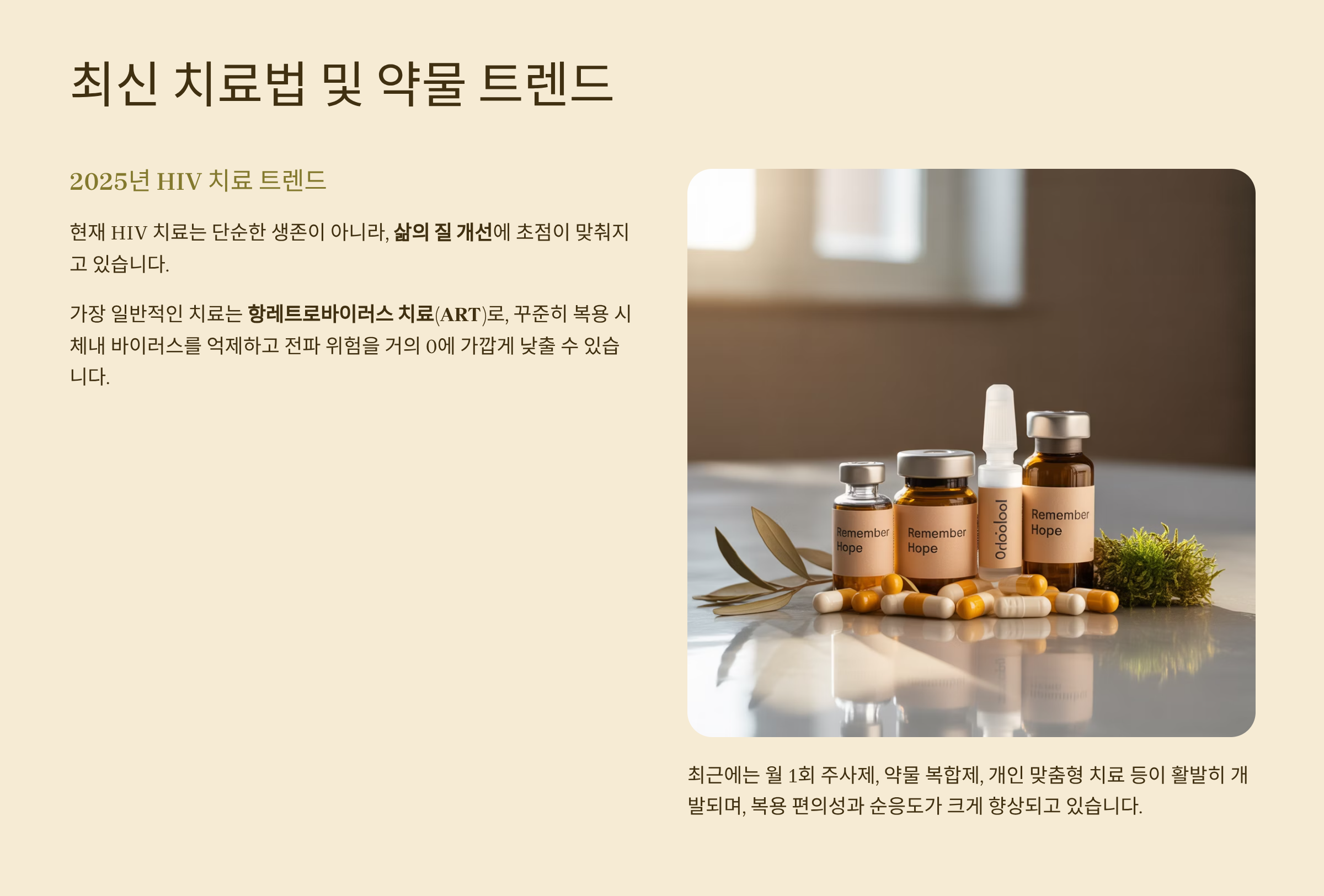 2025년 현재 HIV 치료는 단순한 생존이 아니라, 삶의 질 개선에 초점이 맞춰지고 있어요. 가장 일반적인 치료는 항레트로바이러스 치료(ART)로, 꾸준히 복용 시 체내 바이러스를 억제하고 전파 위험을 거의 0에 가깝게 낮출 수 있어요. 최근에는 월 1회 주사제, 약물 복합제, 개인 맞춤형 치료 등이 활발히 개발되며, 복용 편의성과 순응도가 크게 향상되고 있답니다.
