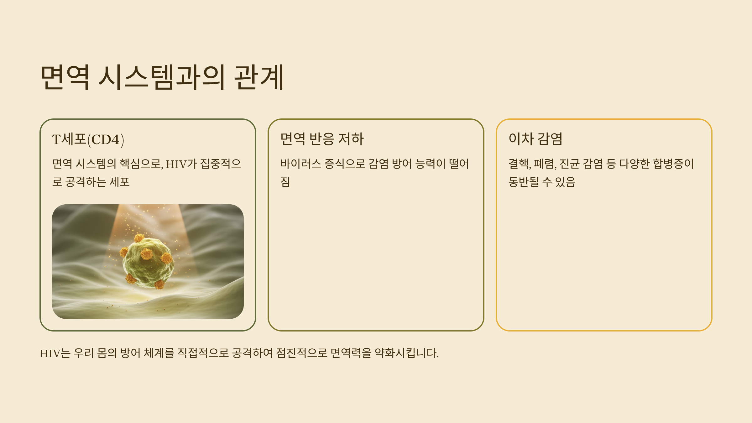 | T세포(CD4) | 면역 시스템의 핵심으로, HIV가 집중적으로 공격하는 세포 |