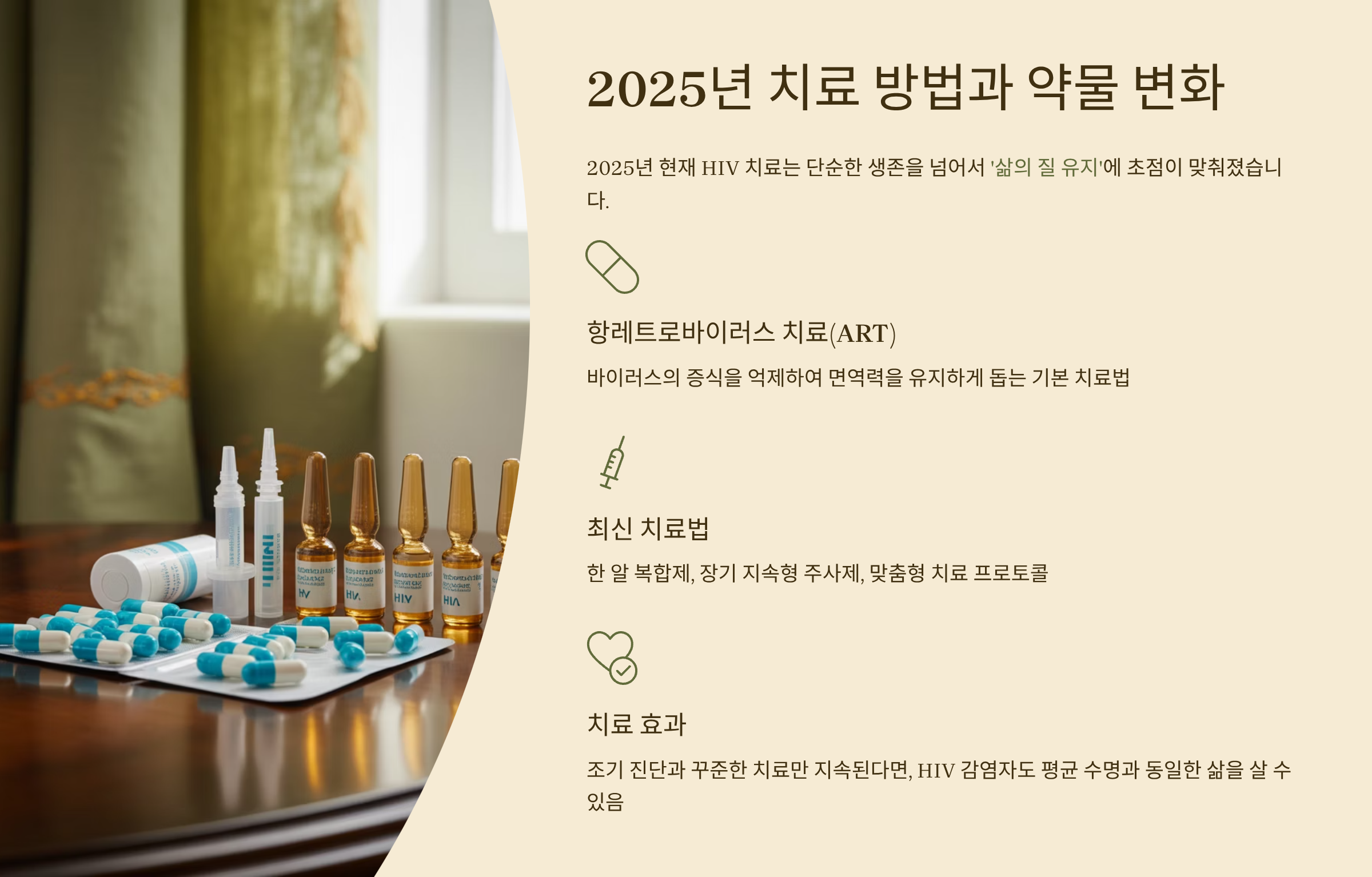 2025년 현재 HIV 치료는 단순한 생존을 넘어서 ‘삶의 질 유지’에 초점이 맞춰졌습니다. 대표적인 치료법은 여전히 항레트로바이러스 치료(ART)이며, 이는 바이러스의 증식을 억제하여 면역력을 유지하게 돕습니다. 최근에는 한 알 복합제, 장기 지속형 주사제, 맞춤형 치료 프로토콜까지 등장하며 개인의 편의성과 부작용 최소화를 동시에 추구하고 있어요. 조기 진단과 꾸준한 치료만 지속된다면, HIV 감염자도 평균 수명과 동일한 삶을 살 수 있습니다.