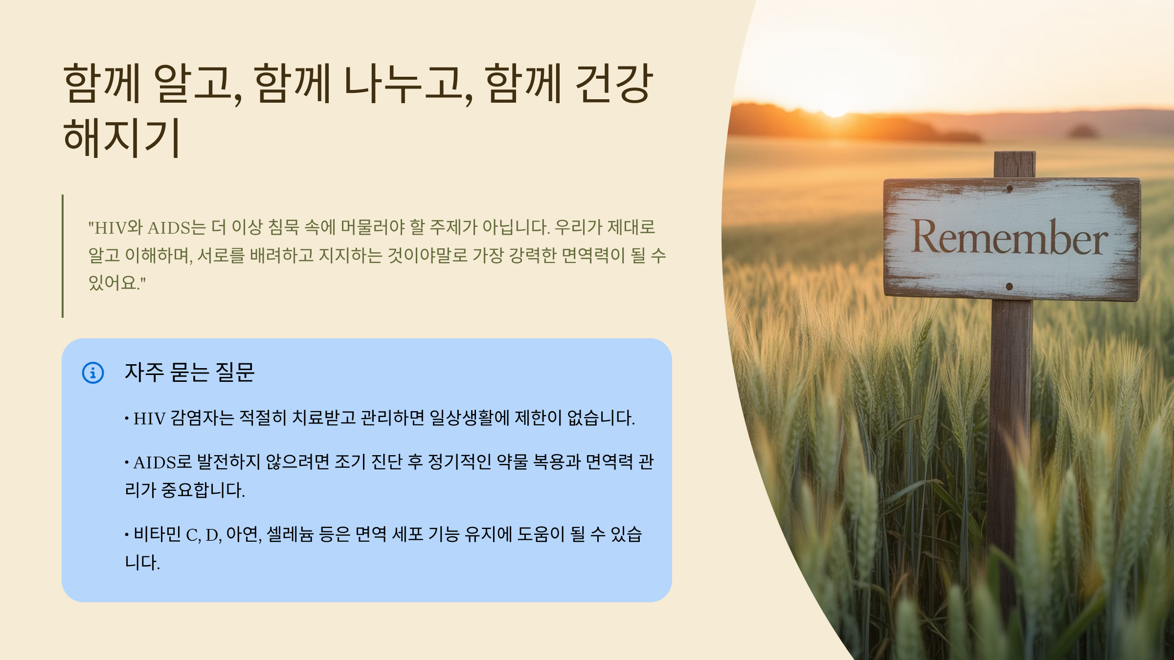 HIV와 AIDS는 더 이상 침묵 속에 머물러야 할 주제가 아닙니다. 우리가 제대로 알고 이해하며, 서로를 배려하고 지지하는 것이야말로 가장 강력한 면역력이 될 수 있어요. 만약 이 글이 당신의 생각을 조금이라도 바꾸었다면, 그것만으로도 변화는 시작된 거예요. 함께 알고, 함께 나누고, 함께 건강해지는 길로 나아가 보아요.