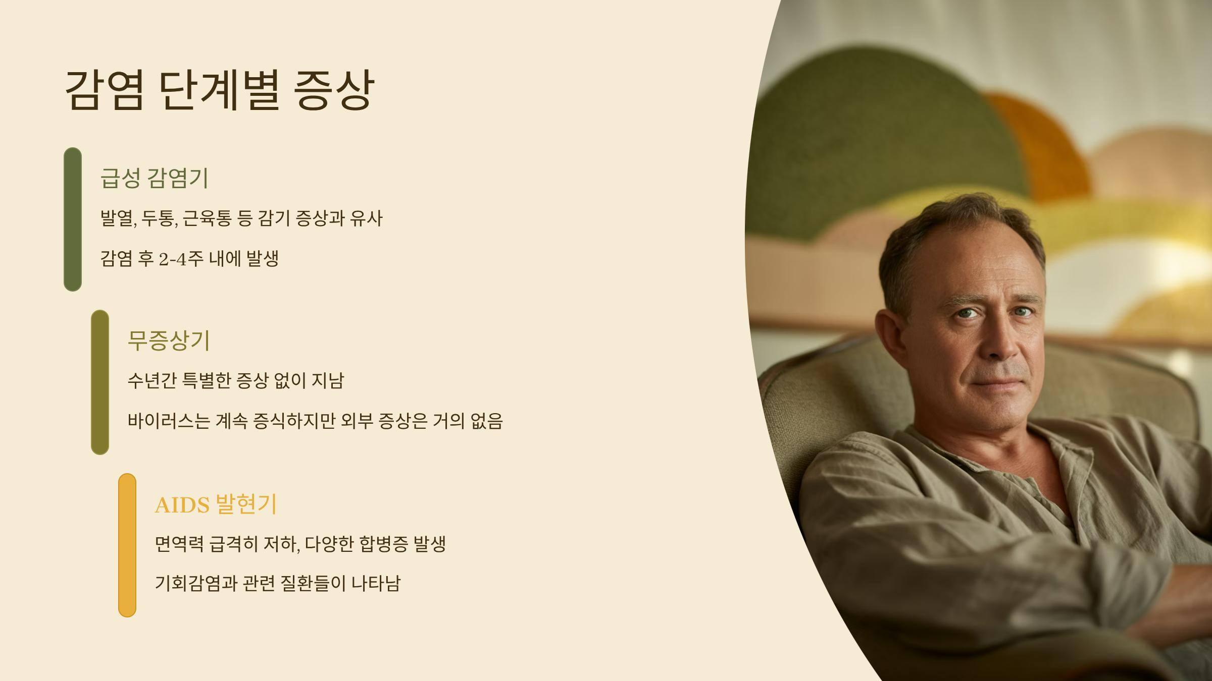 HIV는 단계별로 증상이 다르게 나타나요. 초기에는 대부분 감기와 유사한 증상으로 나타나고, 점차 면역력이 약해지며 다양한 질환이 발생할 수 있어요.
