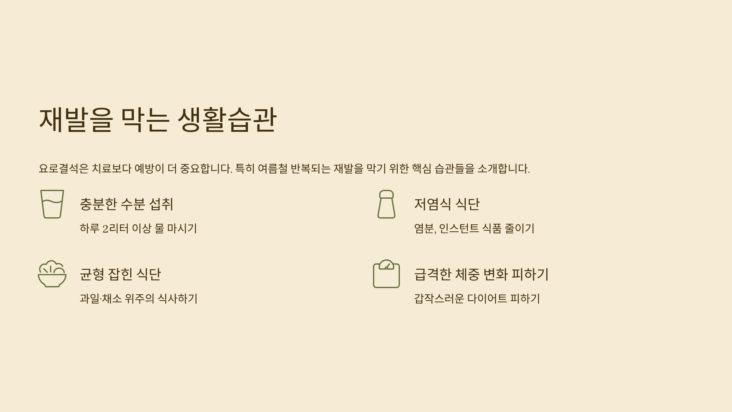요로결석은 치료보다 예방이 더 중요해요. 특히 여름철 반복되는 재발을 막기 위해서는 아래의 습관들을 꼭 실천해보세요.