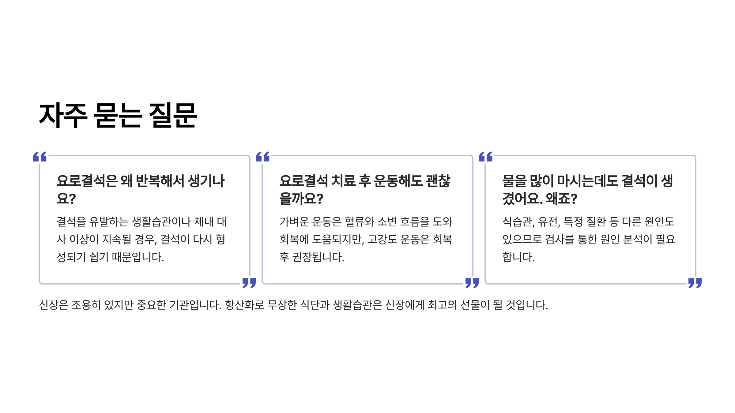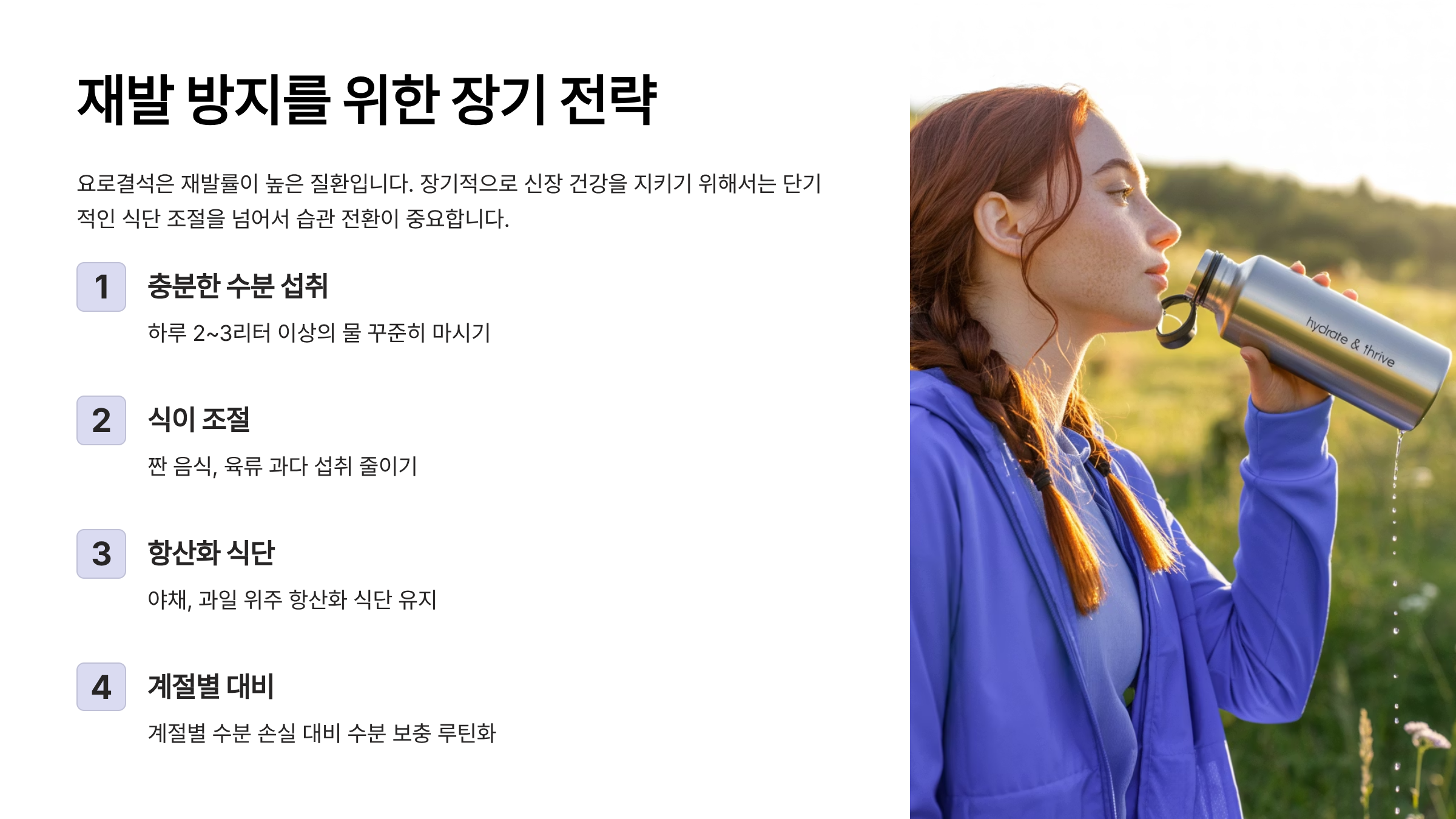 요로결석은 재발률이 높은 질환입니다. 장기적으로 신장 건강을 지키기 위해서는 단기적인 식단 조절을 넘어서 습관 전환이 중요해요.