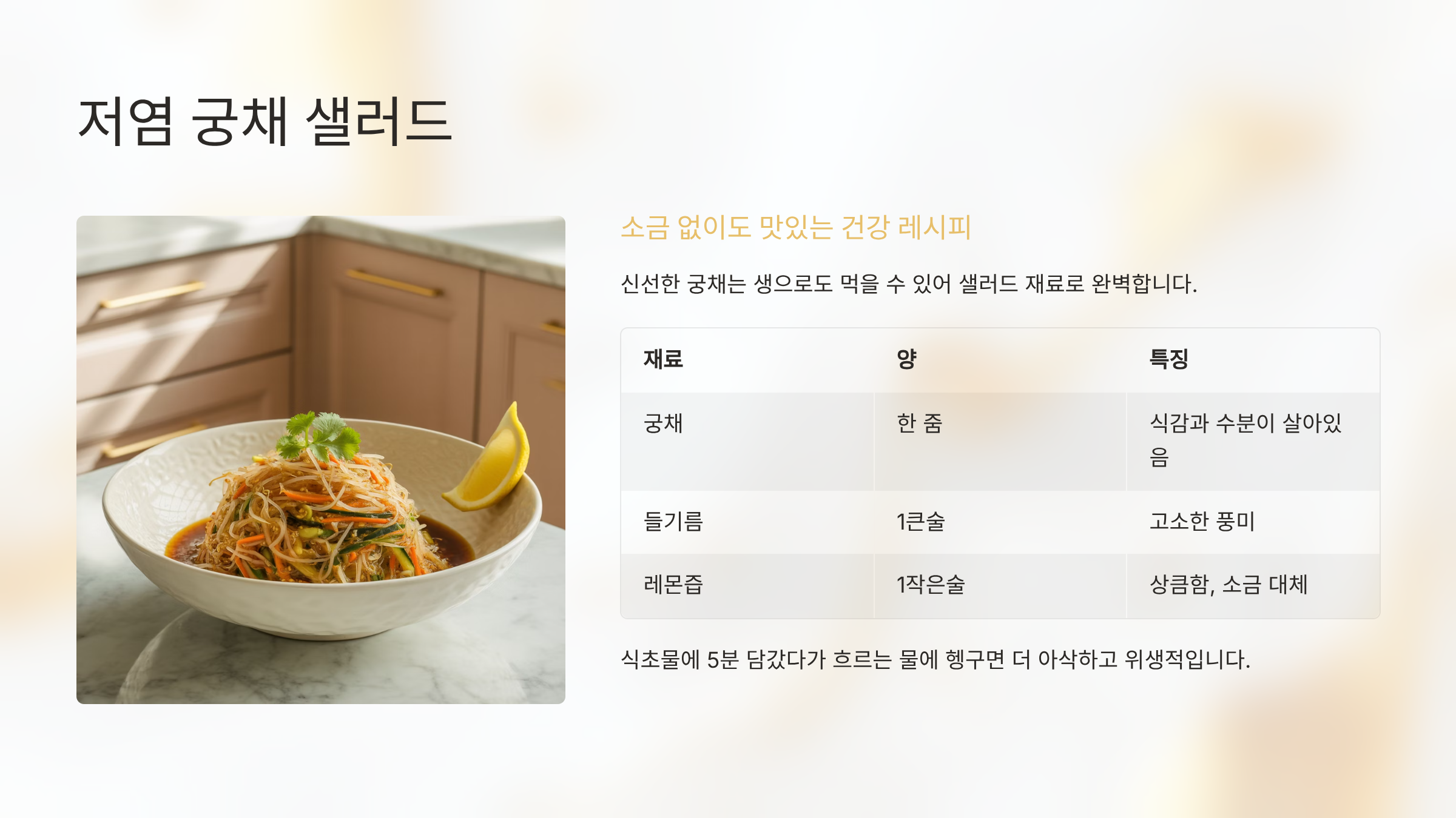 오늘 소개해드린 궁채 요리들, 어떠셨나요? 저도 처음엔 반신반의했는데, 매일 식탁에 올릴수록 확실히 몸이 가벼워졌고, 짠 음식에 대한 의존도도 줄었어요. 작은 변화가 건강을 얼마나 바꾸는지, 직접 느껴보셨으면 좋겠어요. 여러분도 오늘 저녁, 궁채 하나로 식탁의 분위기를 바꿔보시는 건 어떨까요? 댓글로 여러분의 레시피도 공유해주세요. 우리 함께 더 맛있고 건강한 삶 만들어가요!