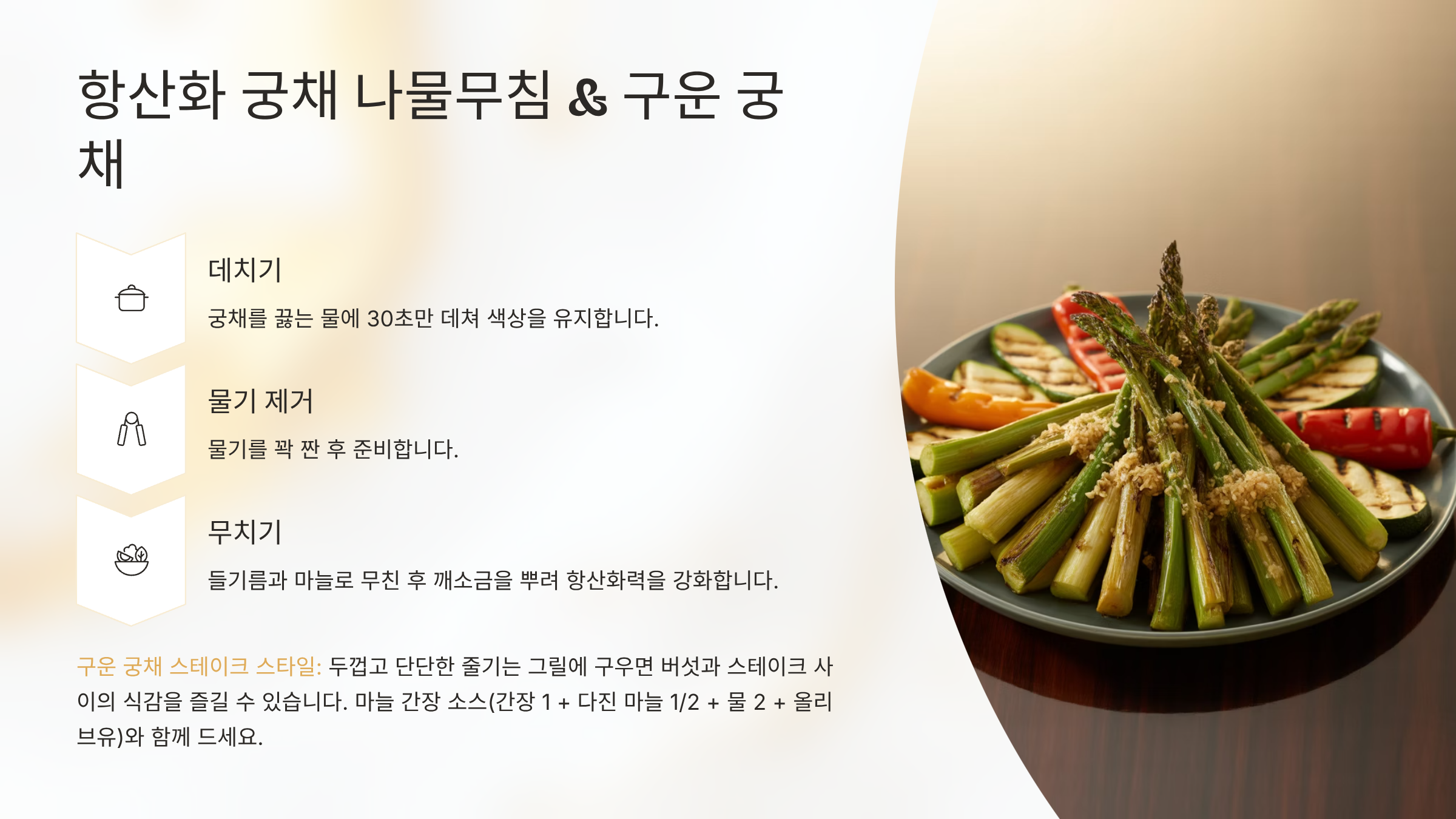전통 나물무침 스타일로 궁채를 조리하면 그 풍미가 극대화됩니다. 항산화 효과를 극대화하려면 다음의 순서대로 해보세요.
