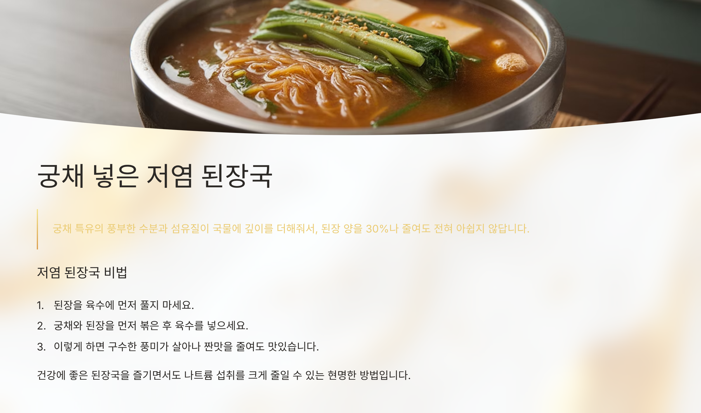 된장국, 좋아하시나요? 그런데 대부분 된장국은 은근히 짠맛이 강해서 건강에 걱정되기도 하죠. 그래서 저는 짠맛을 줄이고도 감칠맛은 배가되는 궁채 된장국을 애용하고 있어요. 궁채 특유의 풍부한 수분과 섬유질이 국물에 깊이를 더해줘서, 된장 양을 30%나 줄여도 전혀 아쉽지 않답니다. 간단한 팁 하나 드리자면, 된장을 육수에 먼저 풀지 말고 궁채랑 먼저 볶은 뒤 넣어보세요. 훨씬 구수하고 풍미가 살아나요!