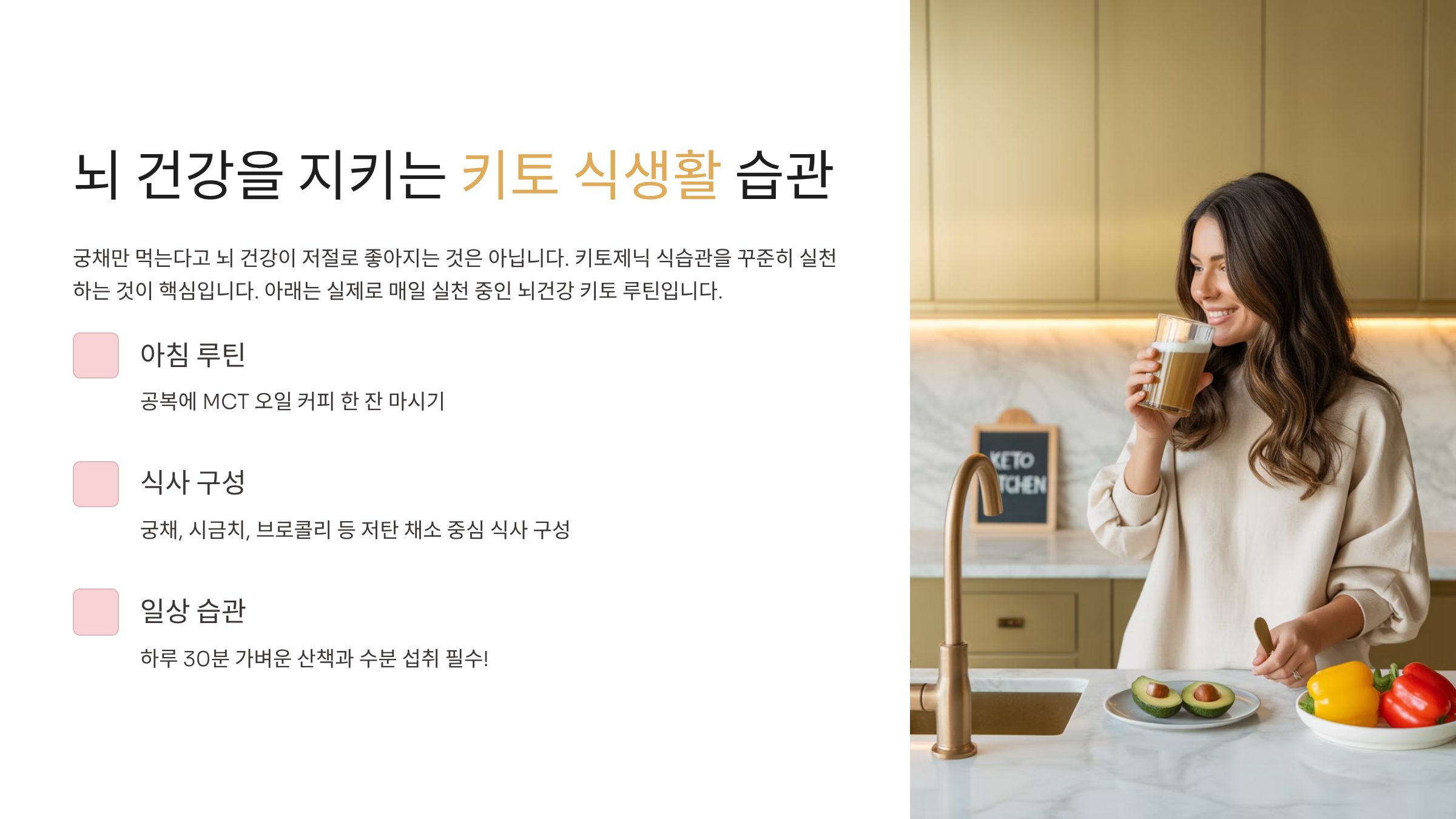 궁채만 먹는다고 뇌 건강이 저절로 좋아지는 건 아니죠. 키토제닉 식습관을 꾸준히 실천하는 게 핵심이에요. 아래 리스트는 제가 실제로 매일 실천 중인 뇌건강 키토 루틴이에요.