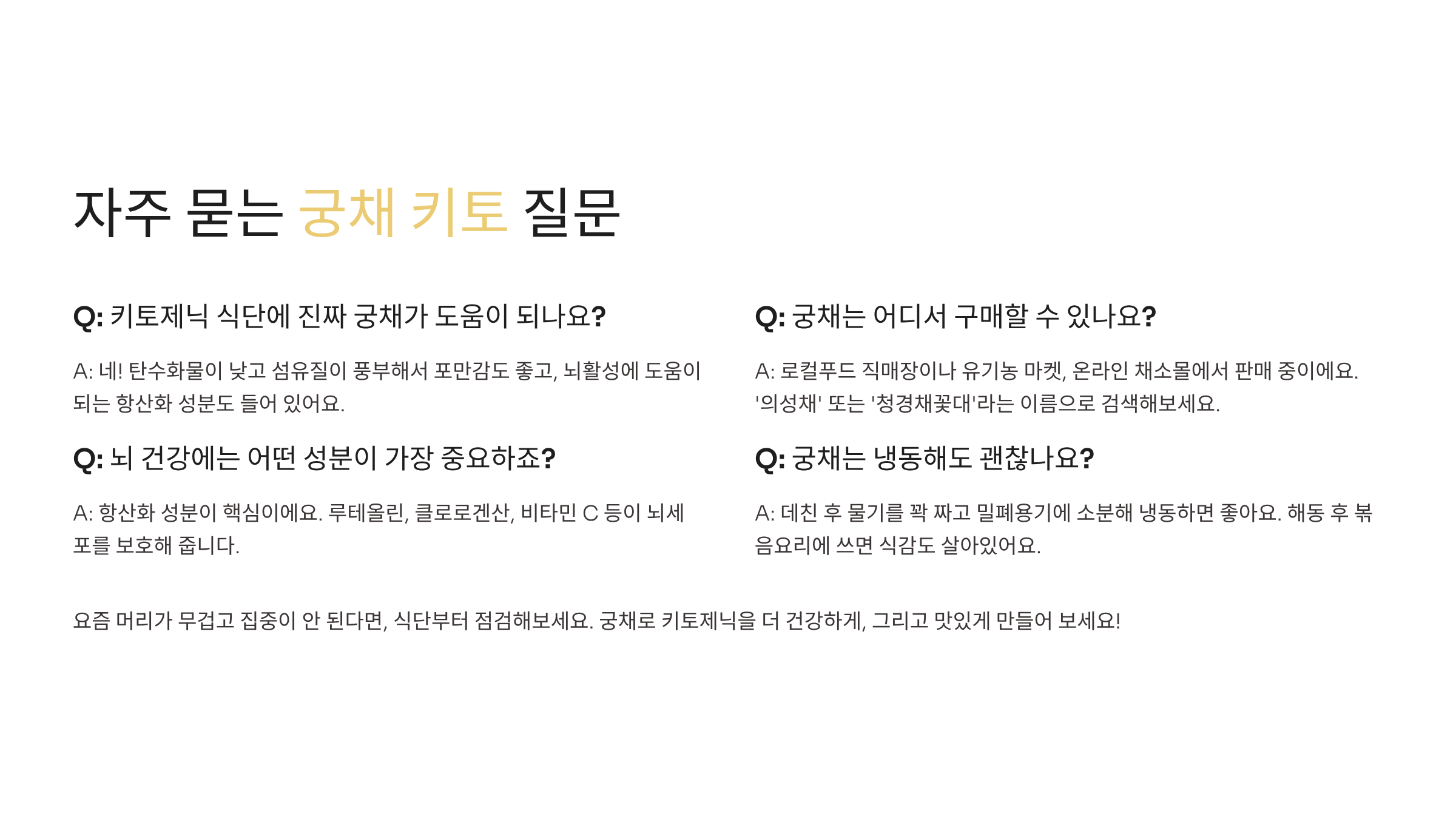 요즘 머리가 무겁고 집중이 안 된다면, 식단부터 점검해보세요. 저도 키토제닉 시작하고 나서 머리가 맑아지는 경험을 자주 해요. 특히 궁채 같은 채소가 이렇게 뇌 건강에 도움을 줄 줄은 몰랐어요. 가볍게 시작해도 좋아요. 하나하나 실천하다 보면 어느새 식탁이 달라지고, 몸도 반응할 거예요. 궁채로 키토제닉을 더 건강하게, 그리고 맛있게 만들어 보세요! 여러분의 식단 팁도 댓글로 나눠주세요 :)