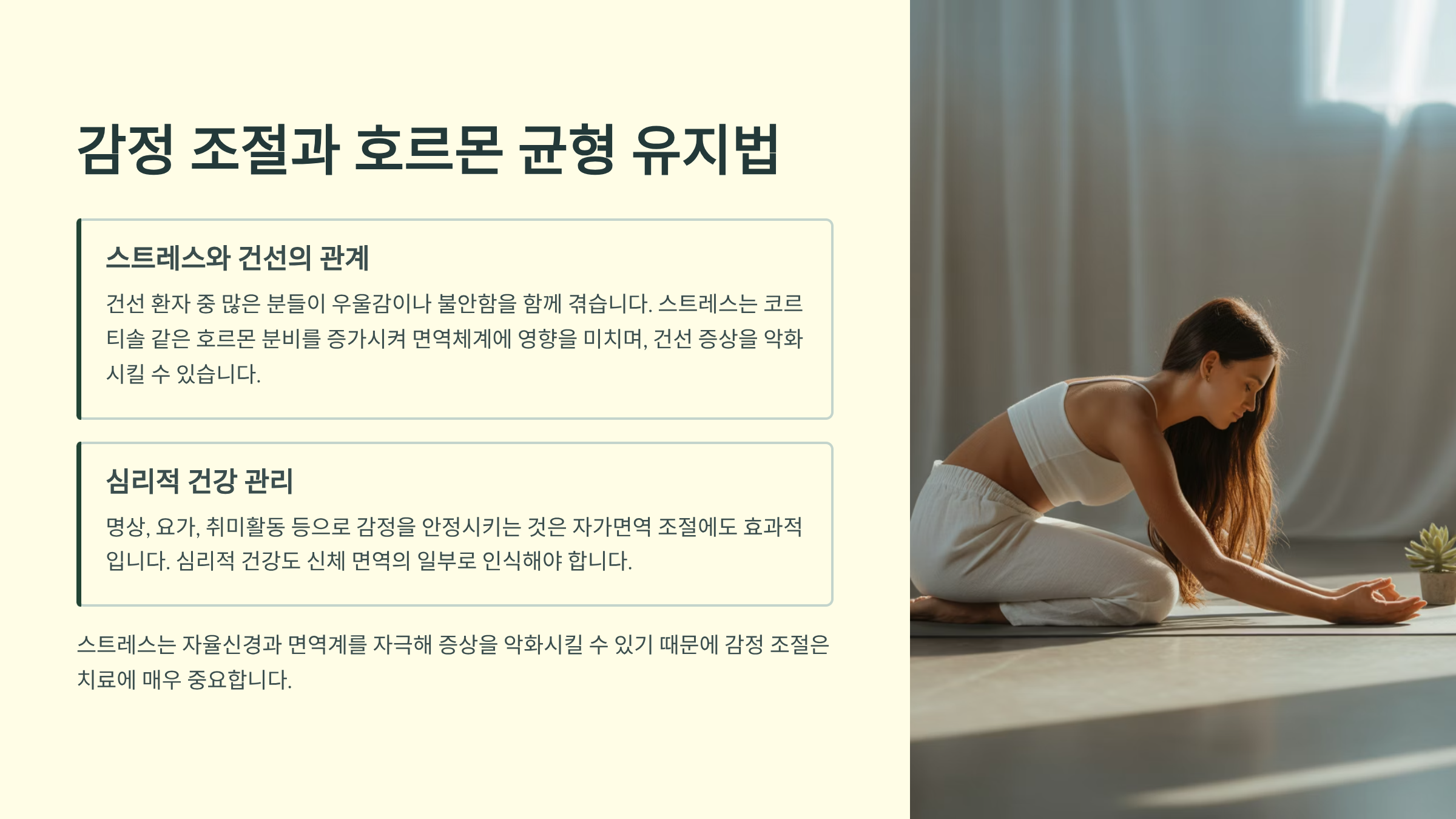 맞습니다. 스트레스는 자율신경과 면역계를 자극해 증상을 악화시킬 수 있기 때문에 감정 조절은 치료에 매우 중요합니다.
