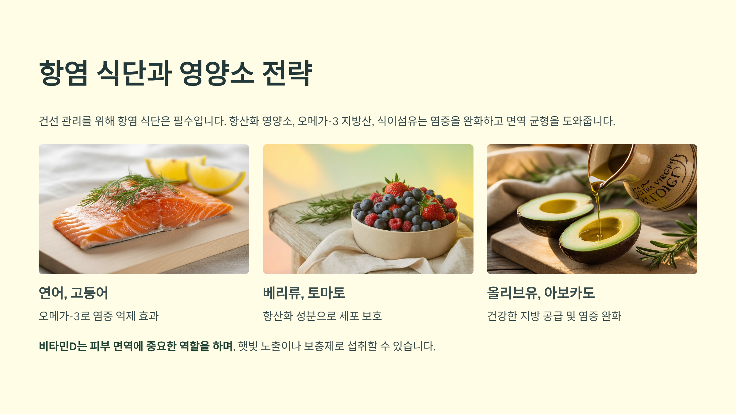 건선 관리를 위해 항염 식단은 필수입니다. 항산화 영양소, 오메가-3 지방산, 식이섬유는 염증을 완화하고 면역 균형을 도와줍니다. 반대로 정제된 탄수화물, 가공육, 설탕이 많은 음식은 피해야 하죠. 특히 비타민D는 피부 면역에 중요한 역할을 하며, 햇빛 노출이나 보충제로 섭취할 수 있어요. 아래는 항염 식품과 그 역할을 정리한 테이블입니다.