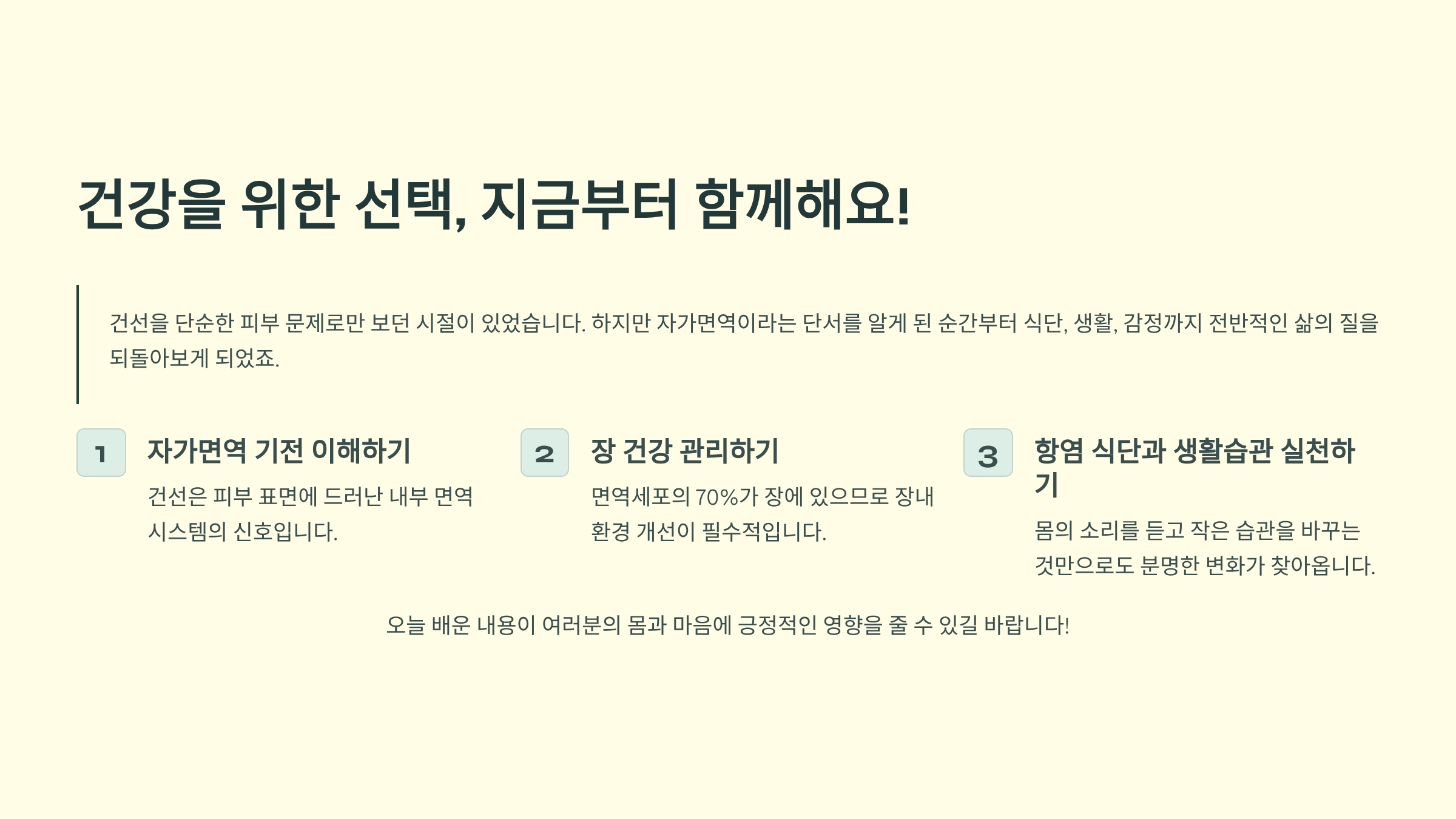 건선을 단순한 피부 문제로만 보던 시절이 있었습니다. 저도 그랬고요. 하지만 자가면역이라는 단서를 알게 된 순간부터 식단, 생활, 감정까지 전반적인 삶의 질을 되돌아보게 되었죠. 몸의 소리를 듣고 작은 습관을 바꾸는 것만으로도 분명한 변화가 찾아옵니다. 오늘 글이 여러분의 몸과 마음에 조금이나마 긍정적인 영향을 줄 수 있길 바랍니다. 우리 모두 건강을 위한 선택, 지금부터 함께해요!