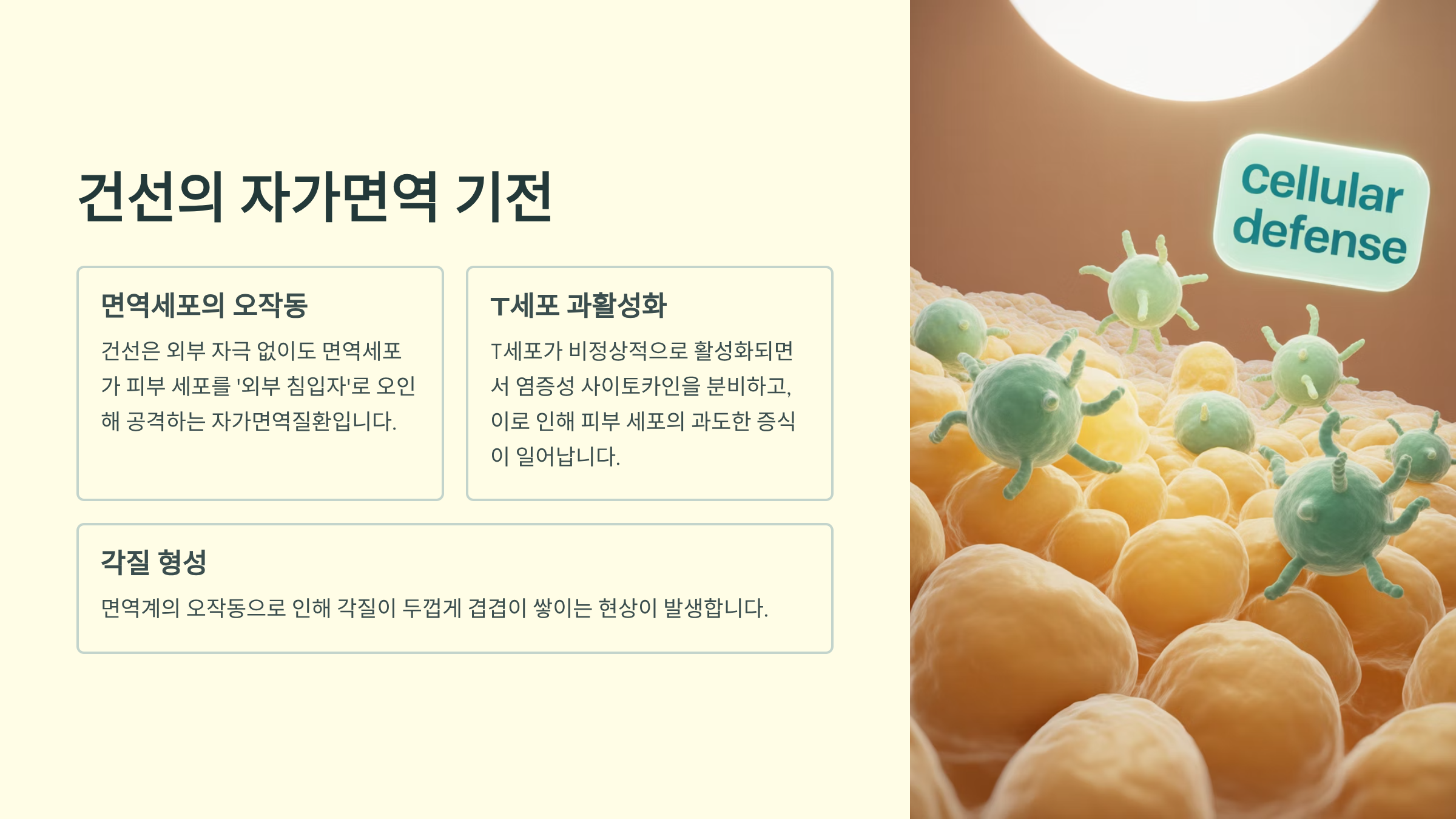 건선은 외부 자극 없이도 면역세포가 피부 세포를 공격해 염증 반응을 일으키는 자가면역질환입니다. 즉, 내 몸이 내 피부를 ‘외부 침입자’로 오인해 과잉 반응하는 것이죠. 특히 T세포가 비정상적으로 활성화되면서 염증성 사이토카인을 분비하고, 이는 피부 세포의 과도한 증식을 유도해 각질이 두껍게 겹겹이 쌓이는 현상을 만듭니다. 단순한 피부 트러블로 보이지만, 그 뿌리는 면역계의 오작동에 있습니다.