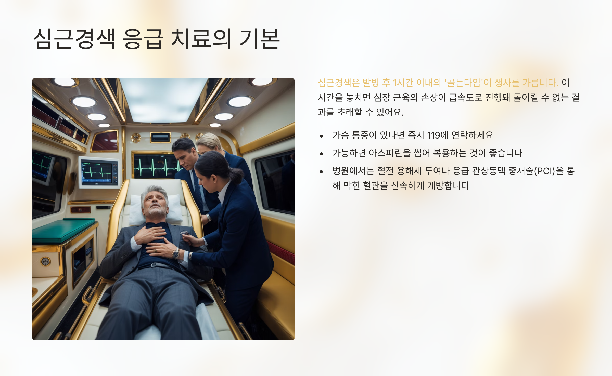 심근경색은 발병 후 1시간 이내의 ‘골든타임’이 생사를 가릅니다. 이 시간을 놓치면 심장 근육의 손상이 급속도로 진행돼 돌이킬 수 없는 결과를 초래할 수 있어요. 응급실 도착 전까지는 가슴 통증이 있다면 즉시 119에 연락하고, 가능하면 아스피린을 씹어 복용하는 것이 좋습니다. 병원에서는 혈전 용해제 투여나 응급 관상동맥 중재술(PCI)을 통해 막힌 혈관을 신속하게 개방하는 것이 핵심입니다.