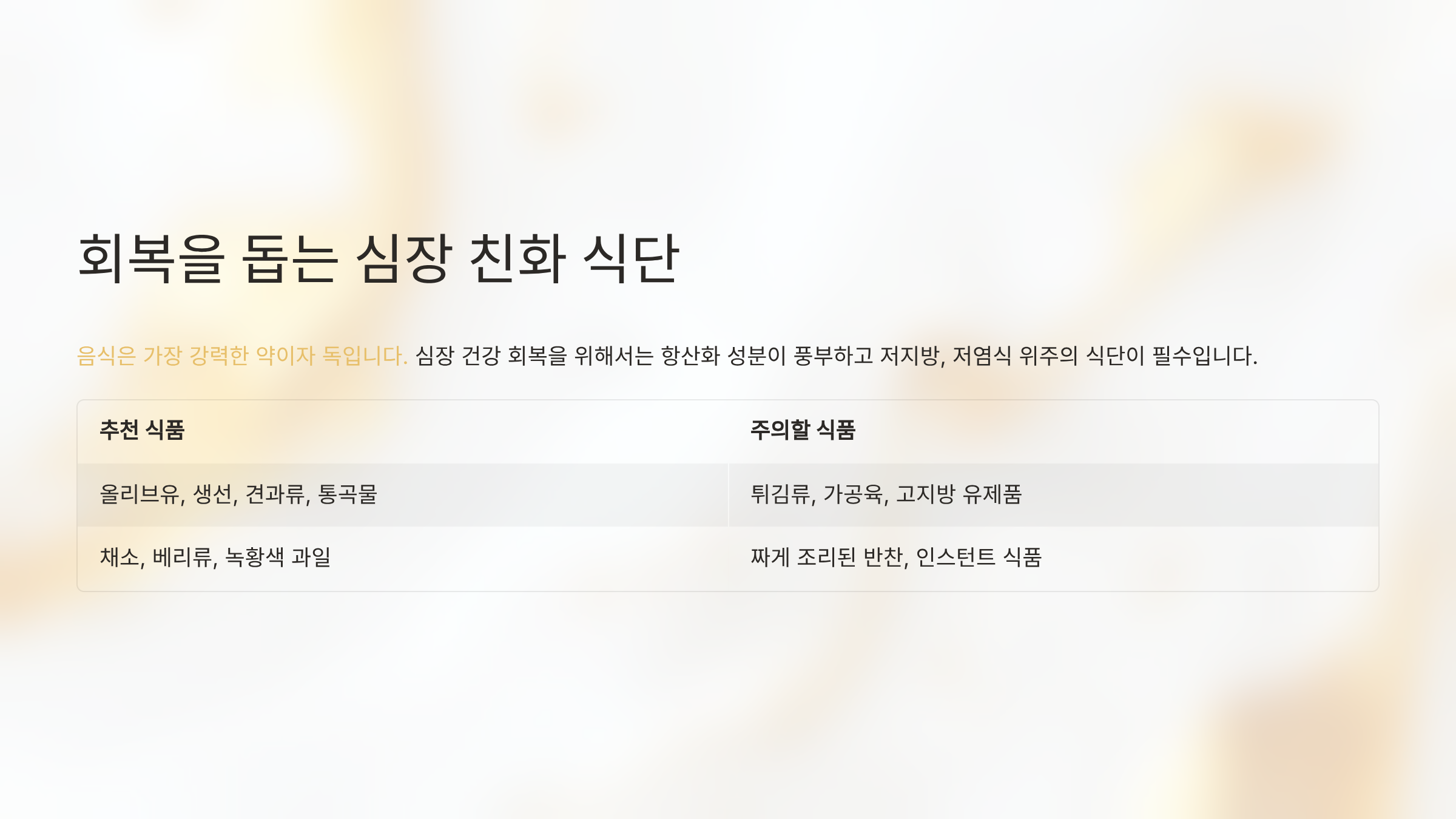 음식은 가장 강력한 약이자 독입니다. 심장 건강 회복을 위해서는 항산화 성분이 풍부하고 저지방, 저염식 위주의 식단이 필수입니다. 아래는 추천 식품과 피해야 할 식품을 정리한 표입니다.