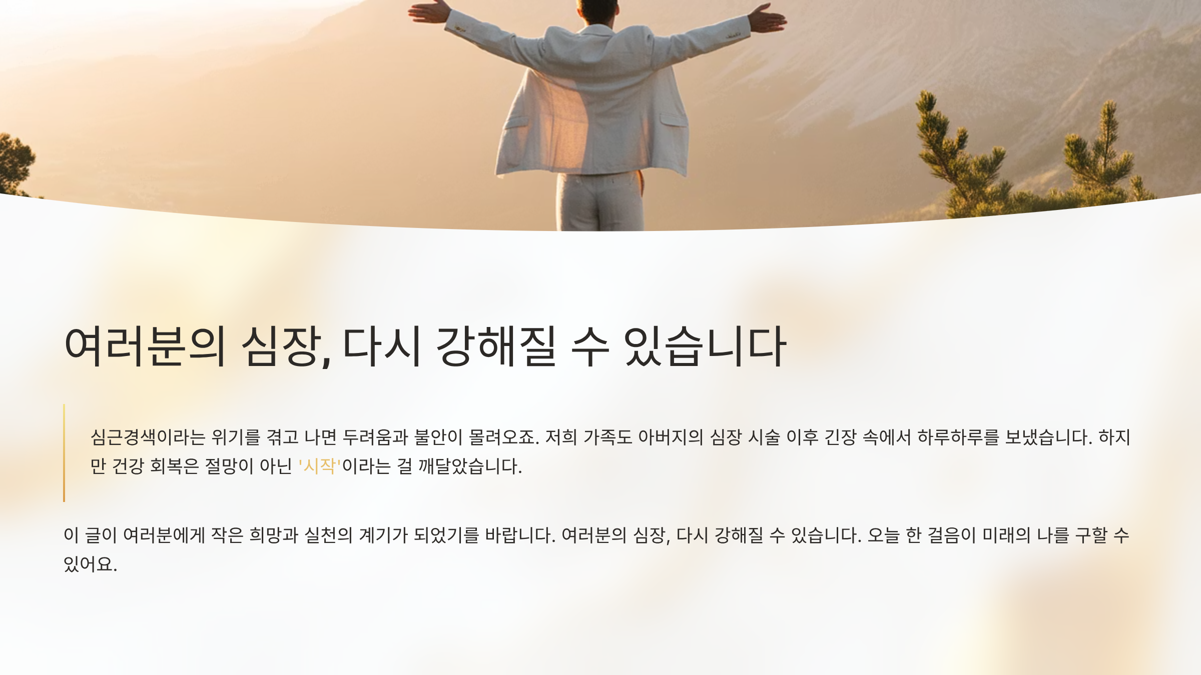 심근경색이라는 위기를 겪고 나면 두려움과 불안이 몰려오죠. 저희 가족도 아버지의 심장 시술 이후 긴장 속에서 하루하루를 보냈습니다. 하지만 건강 회복은 절망이 아닌 '시작'이라는 걸 깨달았습니다. 이 글이 여러분에게 작은 희망과 실천의 계기가 되었기를 바랍니다. 여러분의 심장, 다시 강해질 수 있습니다. 오늘 한 걸음이 미래의 나를 구할 수 있어요.