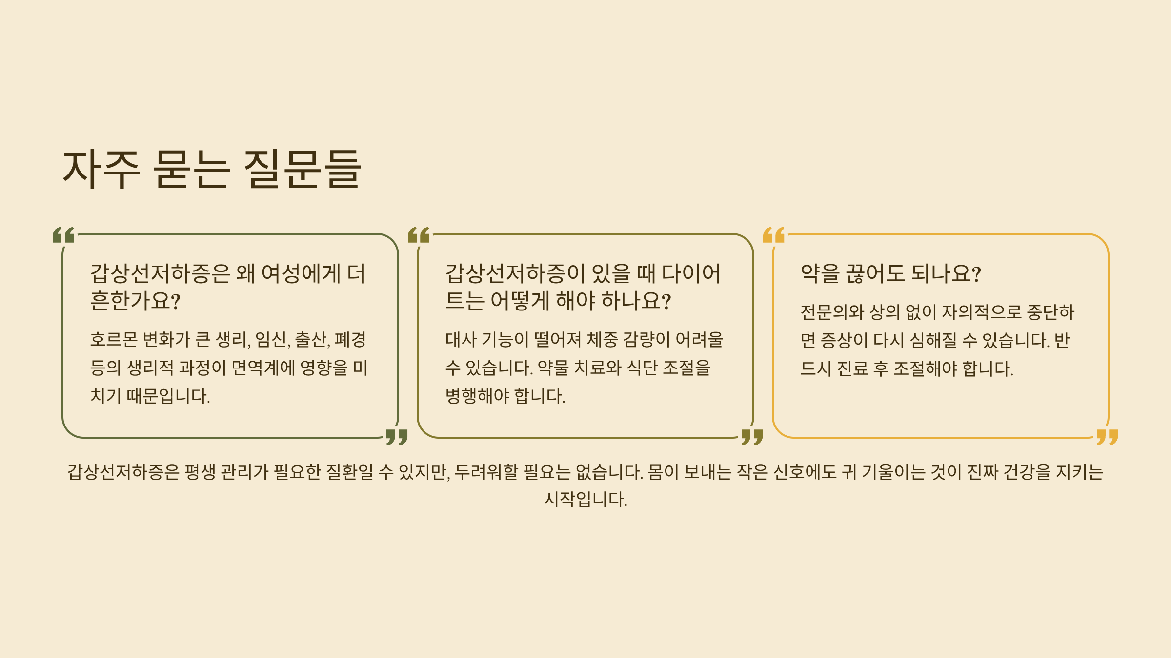 몸이 보내는 작은 신호에도 귀 기울이는 게 진짜 건강을 지키는 시작이라는 말, 이제 조금은 와닿으시죠? 갑상선저하증은 평생 관리가 필요한 질환일 수 있지만, 두려워할 필요는 없어요. 오늘 이 글이 여러분의 건강 여정에 작은 길잡이가 되기를 진심으로 바랍니다. 가족, 친구, 나 자신 모두의 건강을 위해 오늘부터 하나씩 실천해보는 건 어떨까요?