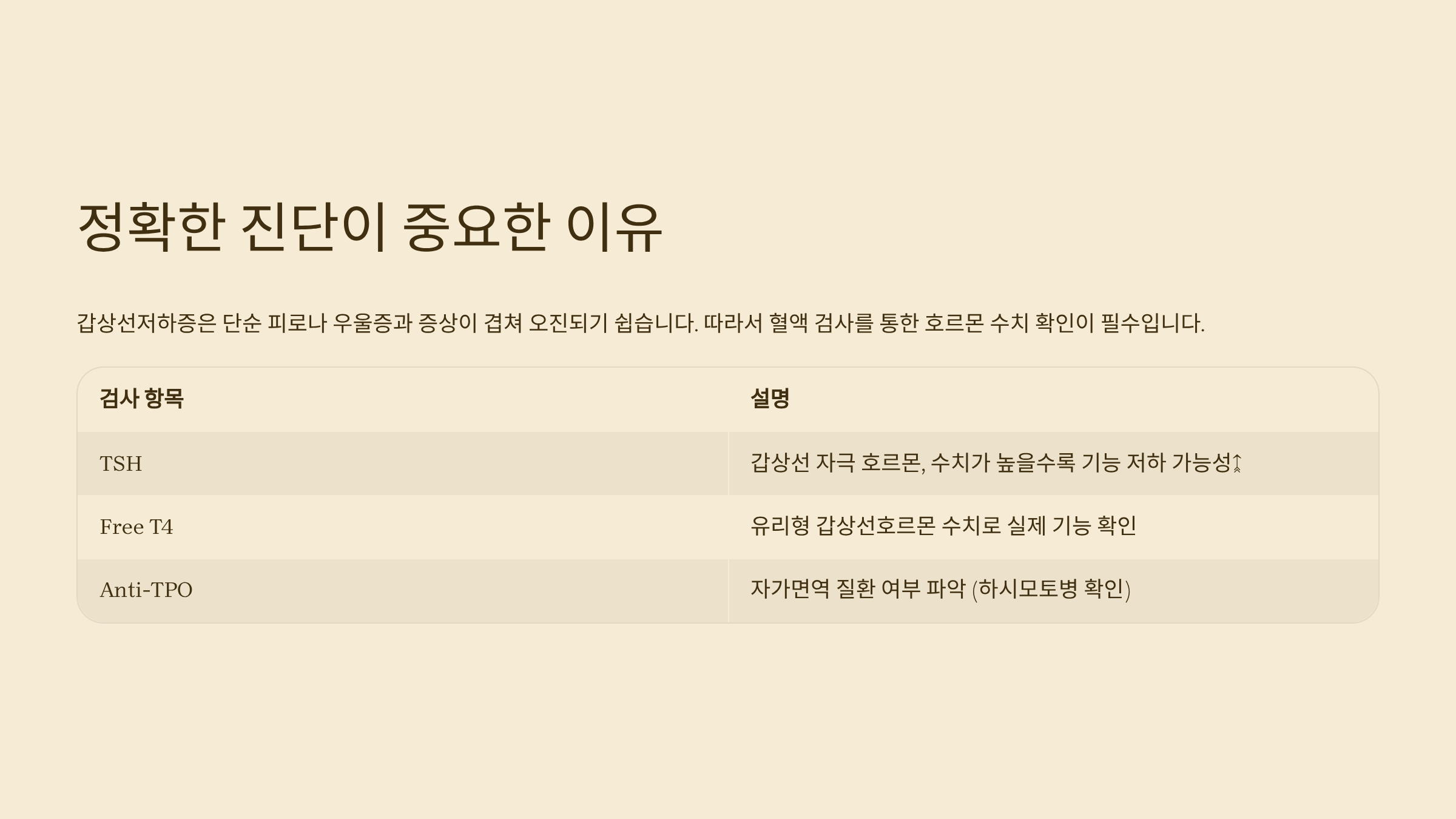 갑상선저하증은 단순 피로나 우울증과 증상이 겹쳐 오진되기 쉽습니다. 따라서 혈액 검사를 통한 호르몬 수치 확인이 필수예요. 아래 표는 주요 진단 항목과 의미를 정리한 것입니다.