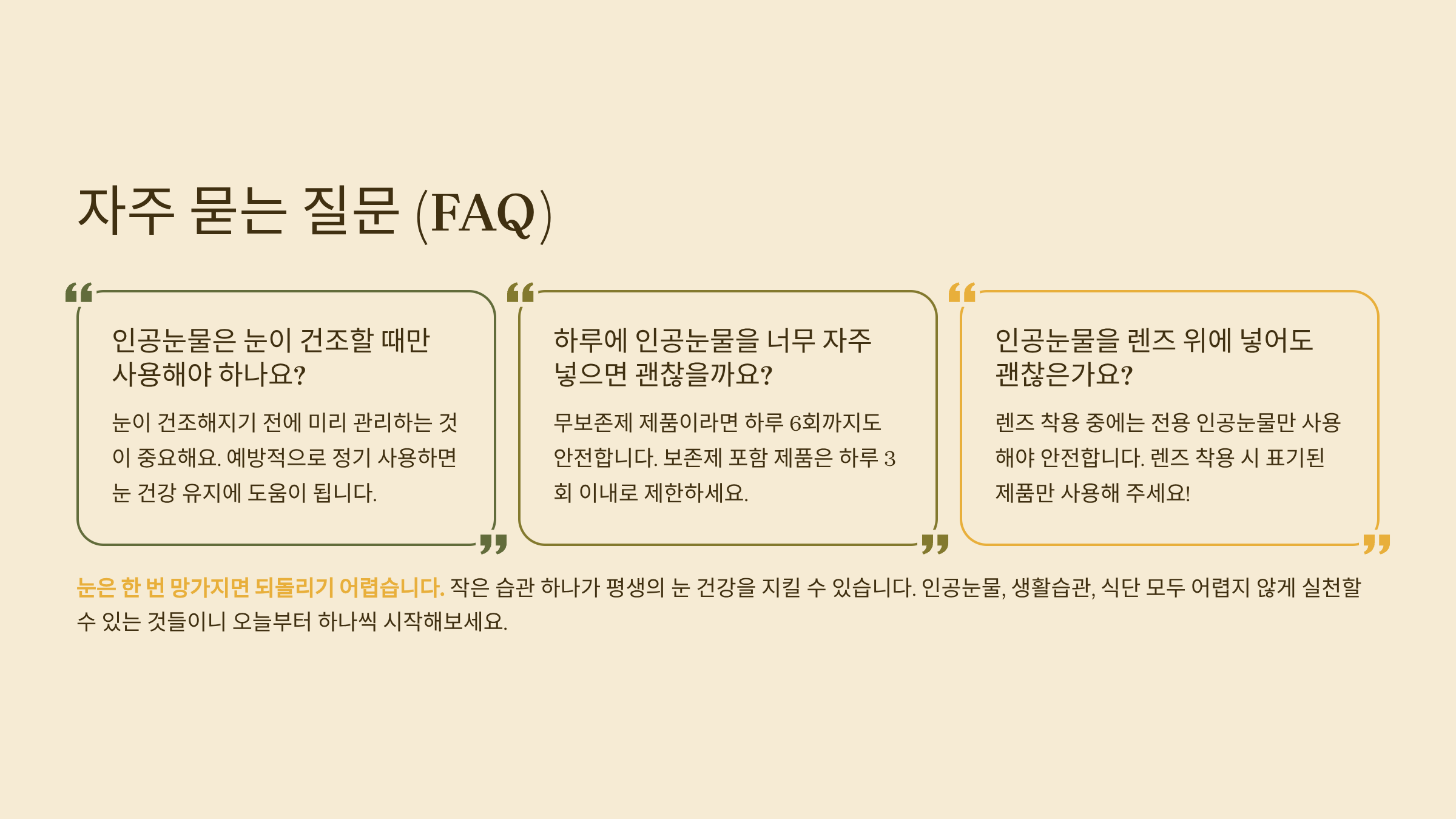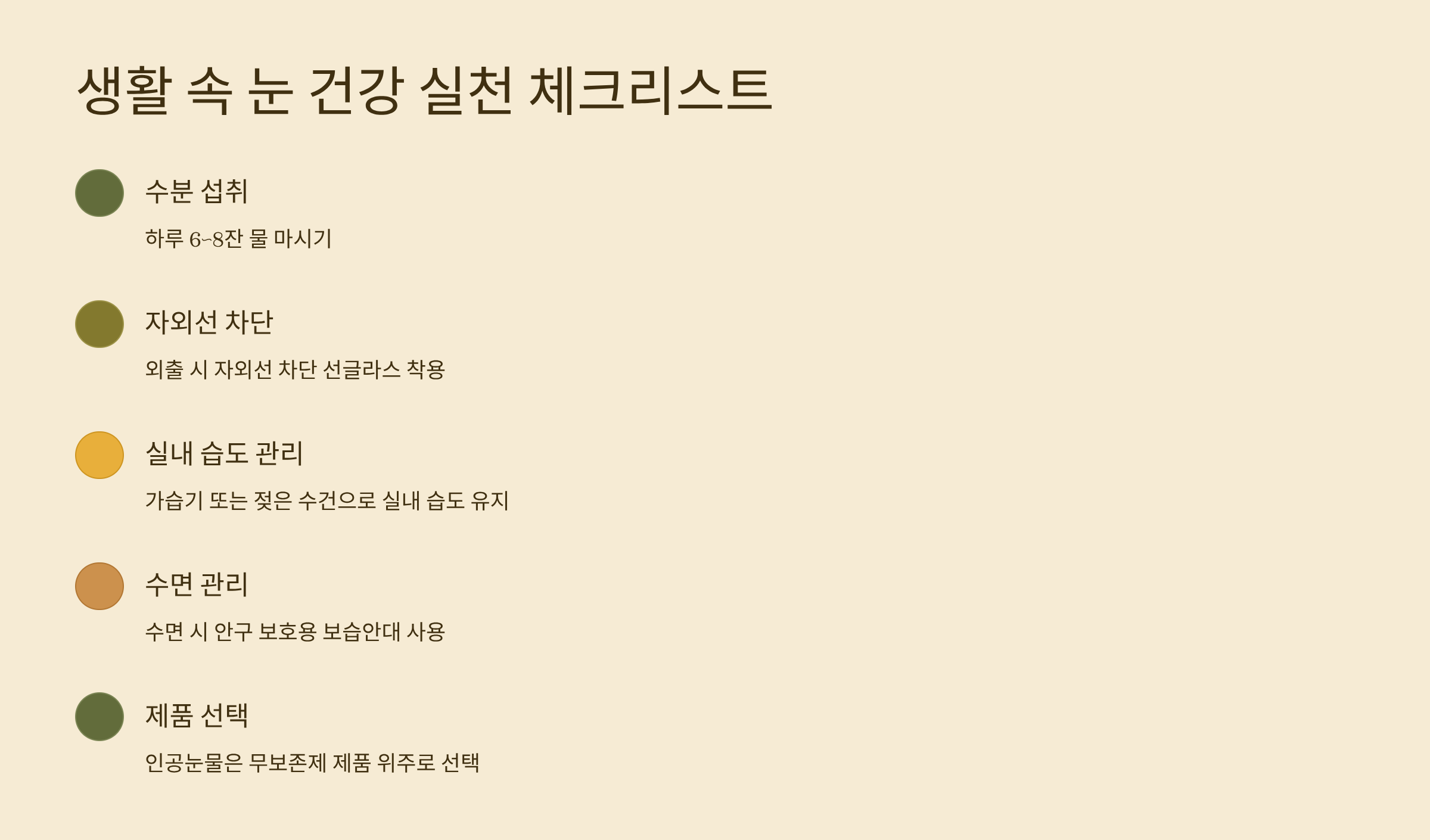 눈은 한 번 망가지면 되돌리기 어렵다는 말, 정말 공감하시죠? 작은 습관 하나가 평생의 눈 건강을 지킬 수 있습니다. 인공눈물, 생활습관, 식단 모두 어렵지 않게 실천할 수 있는 것들이니 오늘부터 하나씩 시작해보세요. 저도 처음엔 번거롭다고 생각했지만, 꾸준히 하다 보니 눈이 편안해지고 시력도 덜 피로해졌어요. 이 글이 여러분의 눈 건강 루틴에 도움이 되길 바라며, 실천하고 있는 팁이 있다면 댓글로 공유해 주세요!