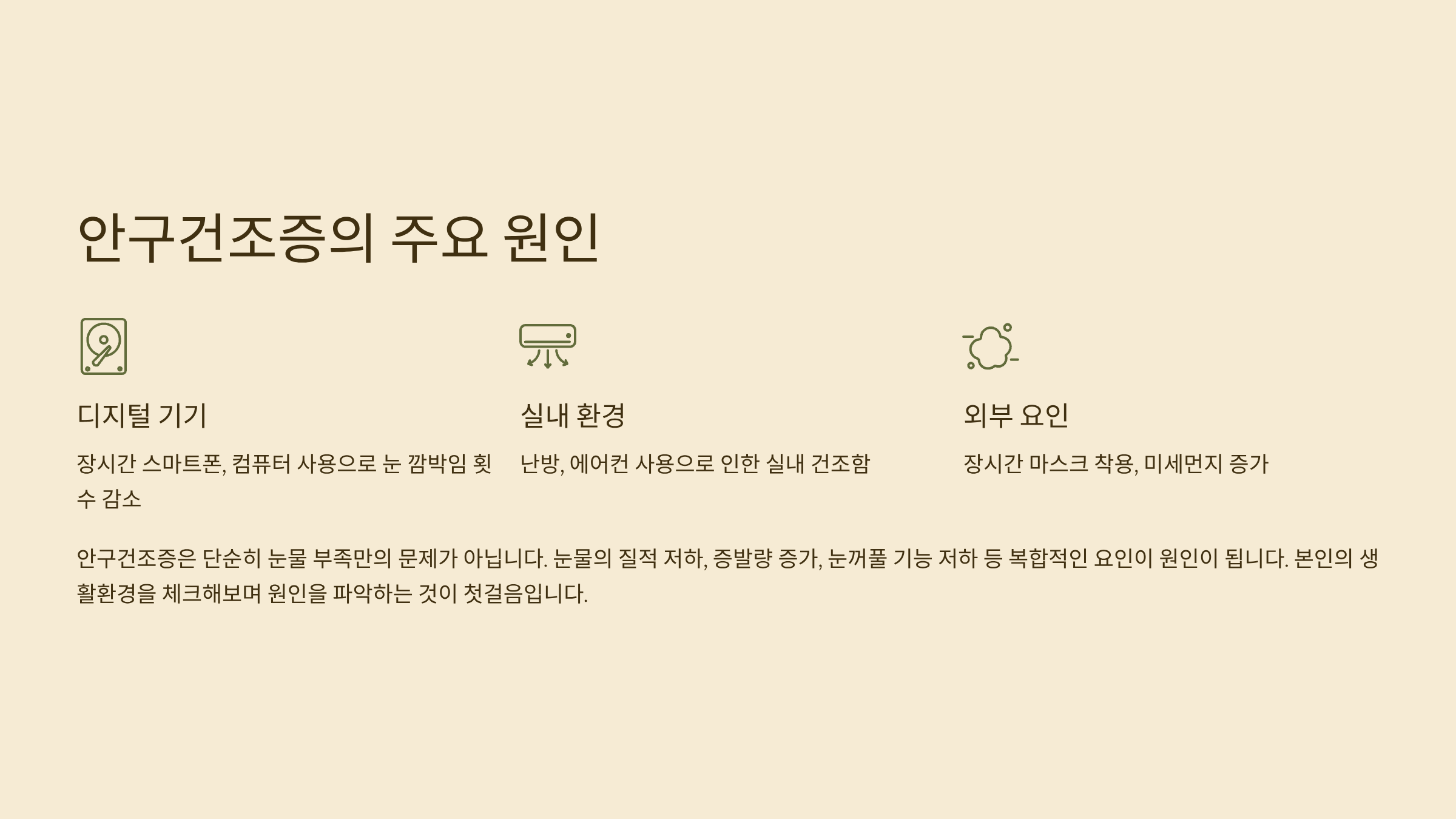 안구건조증은 단순히 눈물 부족만의 문제가 아닙니다. 눈물의 질적 저하, 증발량 증가, 눈꺼풀 기능 저하 등 복합적인 요인이 원인이 됩니다. 특히 2025년에는 장시간 마스크 착용, 미세먼지 증가, 디지털 기기 사용 시간 증가 등이 주요 원인으로 지목되고 있어요. 본인의 생활환경을 체크해보며 원인을 파악하는 것이 첫걸음입니다.