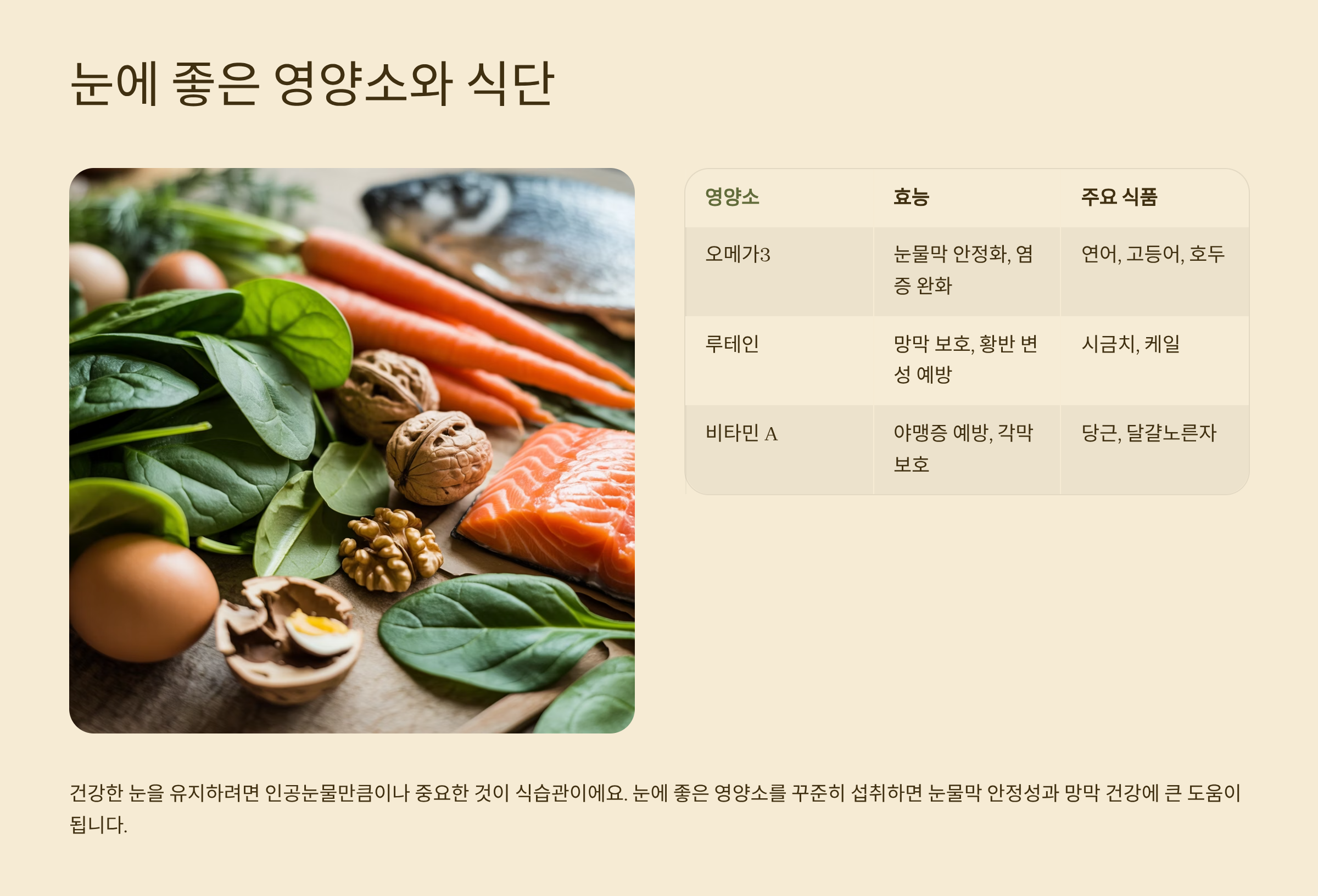 건강한 눈을 유지하려면 인공눈물만큼이나 중요한 것이 식습관이에요. 눈에 좋은 영양소를 꾸준히 섭취하면 눈물막 안정성과 망막 건강에 큰 도움이 됩니다.